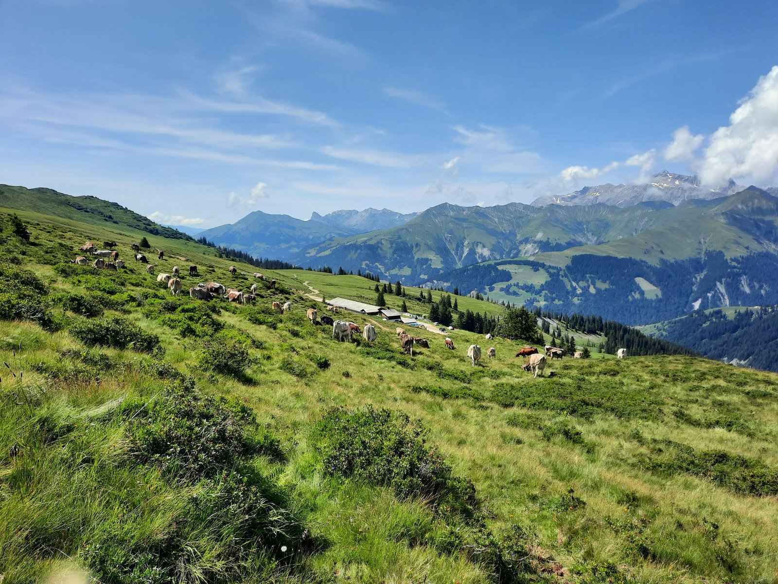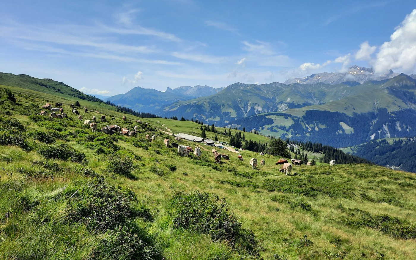 Endlich richtig Sommer! Blicken wir ins Tal, sehen wir, wie überall fleissig gemäht wird. Mit unseren Kühen sind wir nun auf den obersten Weiden vom «Chrüz» auf 2195 Meter über Meer. Damit sie nicht bei zu heissem Wetter die 300 Höhenmeter erklimmen müssen, beginnt unser Hirtenteam bereits morgens um halb drei mit Einstallen. Zu zweit werden nach dem Melken die Kühe auf die saftigen Weiden getrieben.