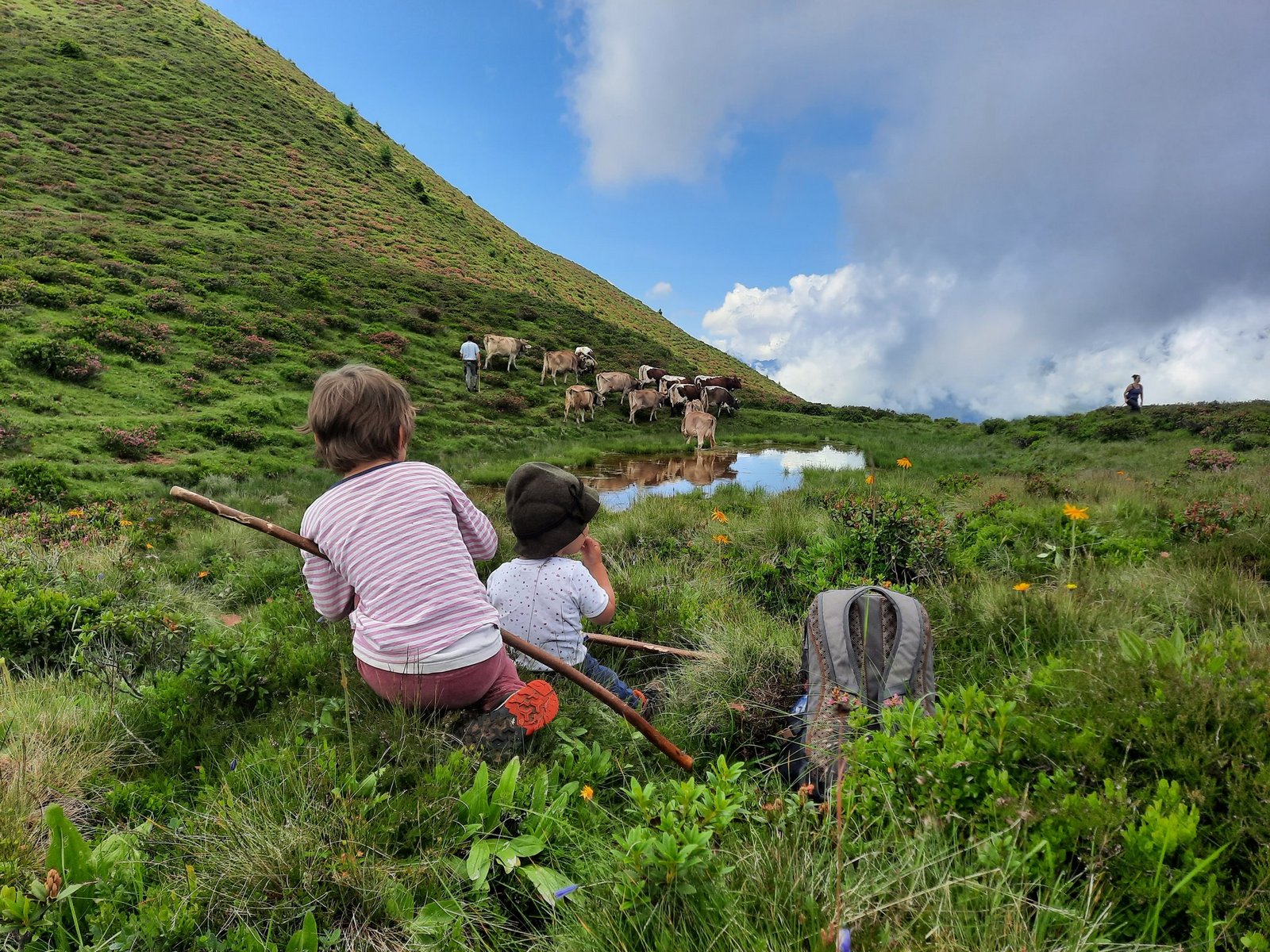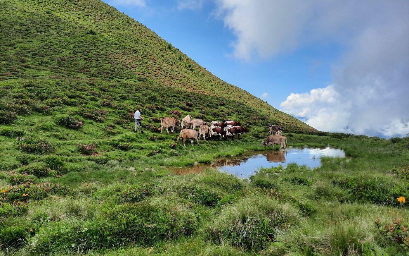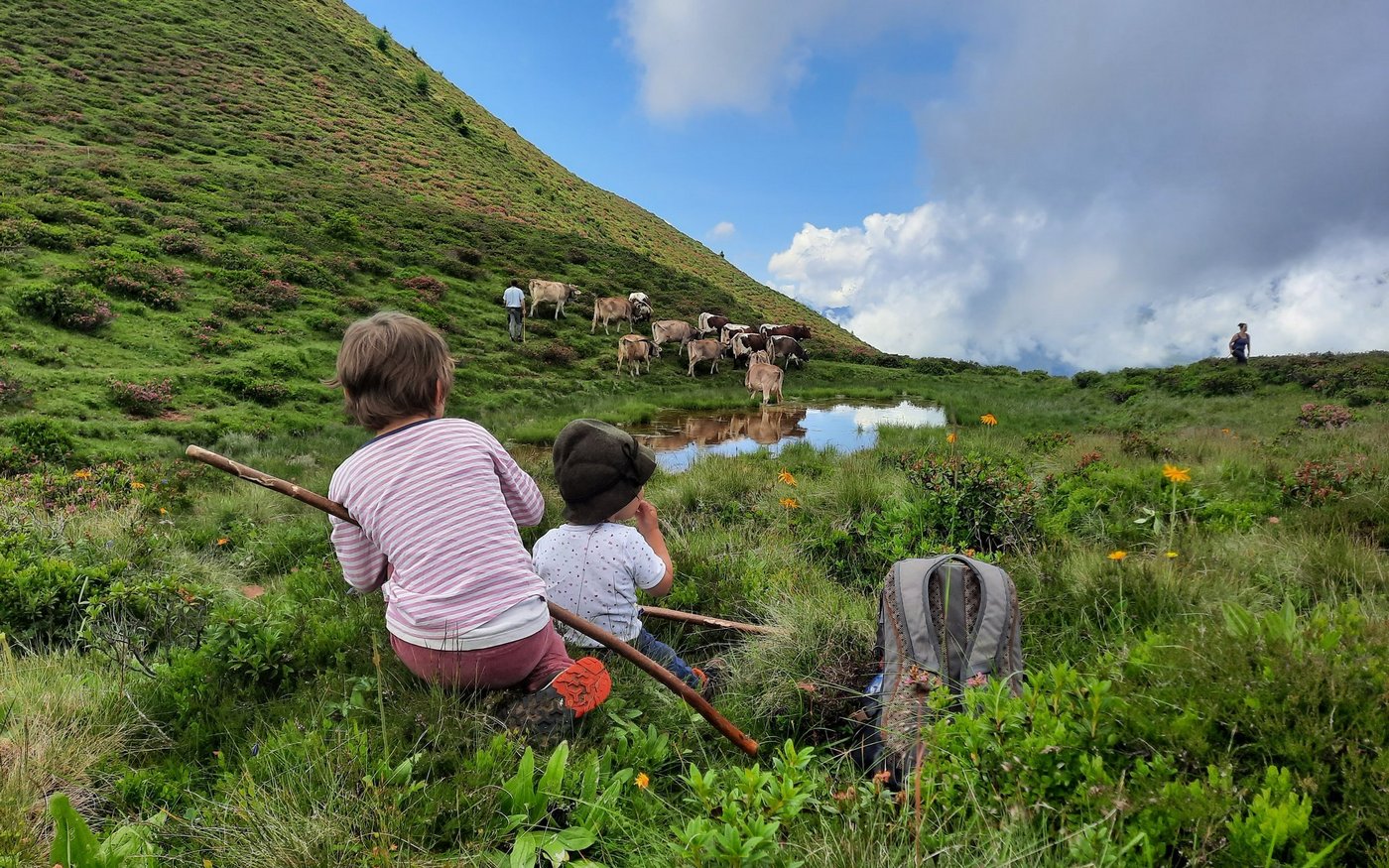 Karin, Andreas mit Cyrill, Ronya und ich marschieren weiter. Als Motivator wartet eine Packung Haribo im Rucksack. Auf dem Grat ist die einzige Wasserquelle fürs Vieh ein kleiner Tümpel, hier liegen die übrigen Kühe im Gras. Gemächlich sind sie am Wiederkäuen. Wir machen eine kurze Pause, anschliessend beginnen wir den Weg ins Tal. Andreas und Karin gehen rechts weg, die Kinder und ich laufen nach links, hinter den Kühen her. Ronya treibt die Kühe schon richtig gut, Cyrill habe ich auf dem Buckel.