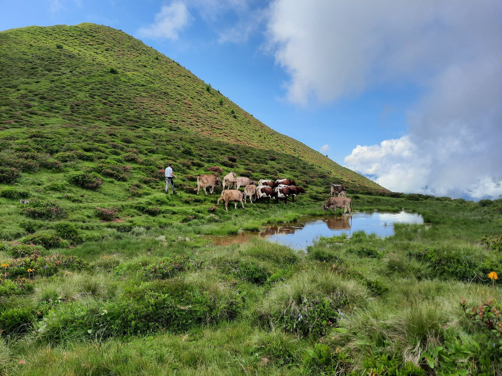 Etwa auf halbem Weg müssen wir mit unserer kleinen Gruppe eine Kehrtwende machen. Da passiert es. Eine Braune kommt zu nahe an eine Pinzgauer. Diese wendet sich abrupt und weist die Braune zurecht. Da wäre nichts Schlimmes dabei, doch die Braune stolpert rückwärts, fällt und bleibt auf dem Rücken zwischen den Alpenrosenbüschen hängen.