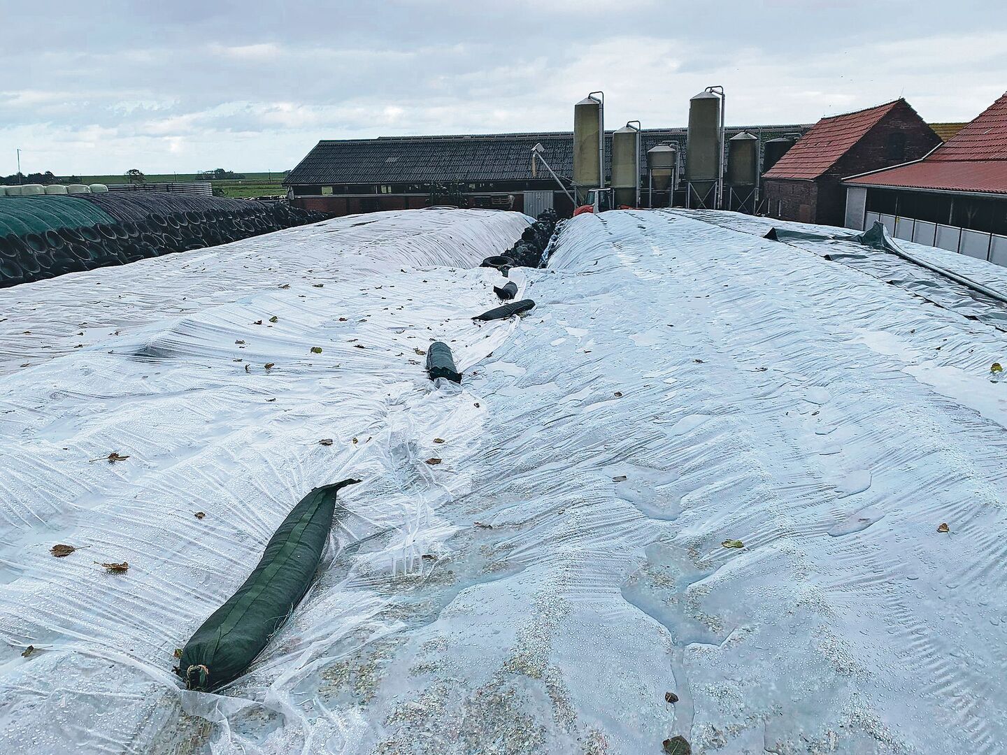 Das Abdecken hat sich gelohnt, denn über Nacht waren ein paar Liter Niederschlag gefallen. Entgegen unseren Bedenken liess sich auch die zweite, eigentliche Silofolie gut über die Unterziehfolie ziehen und ausbreiten. Dabei muss man gut aufpassen, dass alle Sandsäcke, die provisorisch als Beschwerung ausgelegt wurden, nicht versehentlich «miteinsiliert» werden. Auf die Folie kommen noch Silonetze sowie an Strohband gebundene Reifen als Befestigung bei starken Winterstürmen.