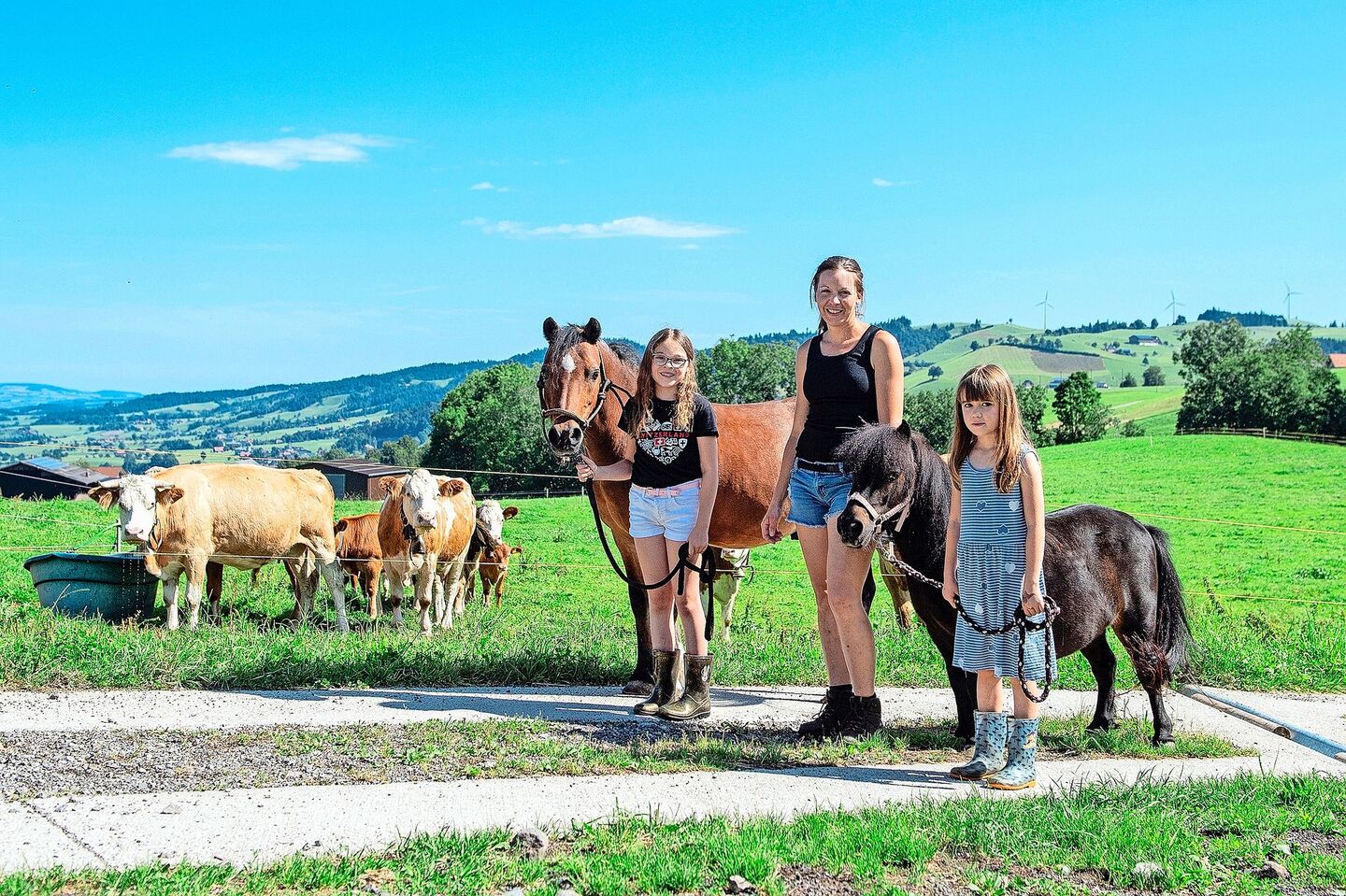 Viehbestand: 9 Mutterkühe mit eigener Aufzucht, 2 Pferde mit eigener Aufzucht, 4 Ponys, 1 Esel, 18 Ziegen, 4 Kaninchen, 15 Hühner, 12 Masttruten und 2 Hunde.