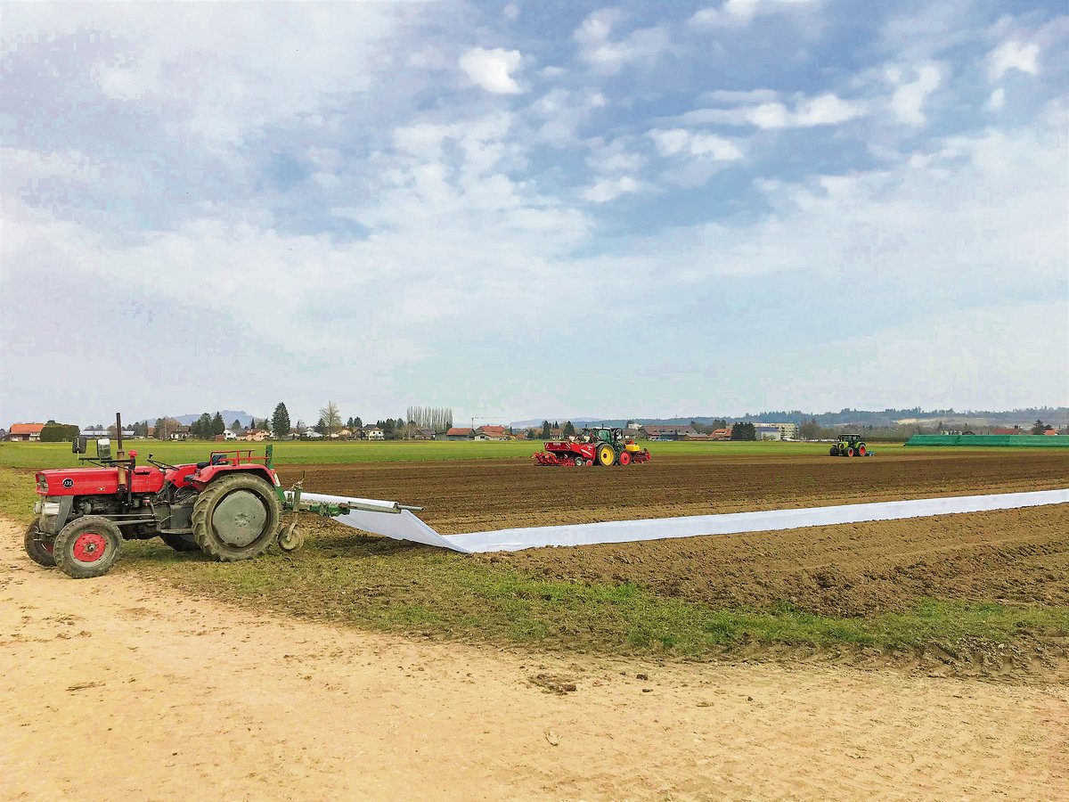Dank der guten Wetter- und Windbedingungen waren die Vliese gut zu platzieren und zu befestigen. Wir arbeiteten zahlreich auf dem Acker; neben den maschinellen Aufgaben konnten wir so speditiv das Vlies auslegen, spannen und mit Erde beschweren.