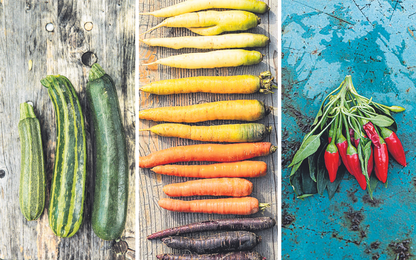 Gemüse: Die Frischwaren in einem Korb oder einer Gemüsekiste präsentieren oder sie in der Hand halten. Oder das Gemüse auf einen alten, gebrauchten Holzuntergrund legen. Das Produkt für den Frischekick mit Wasser besprayen.
