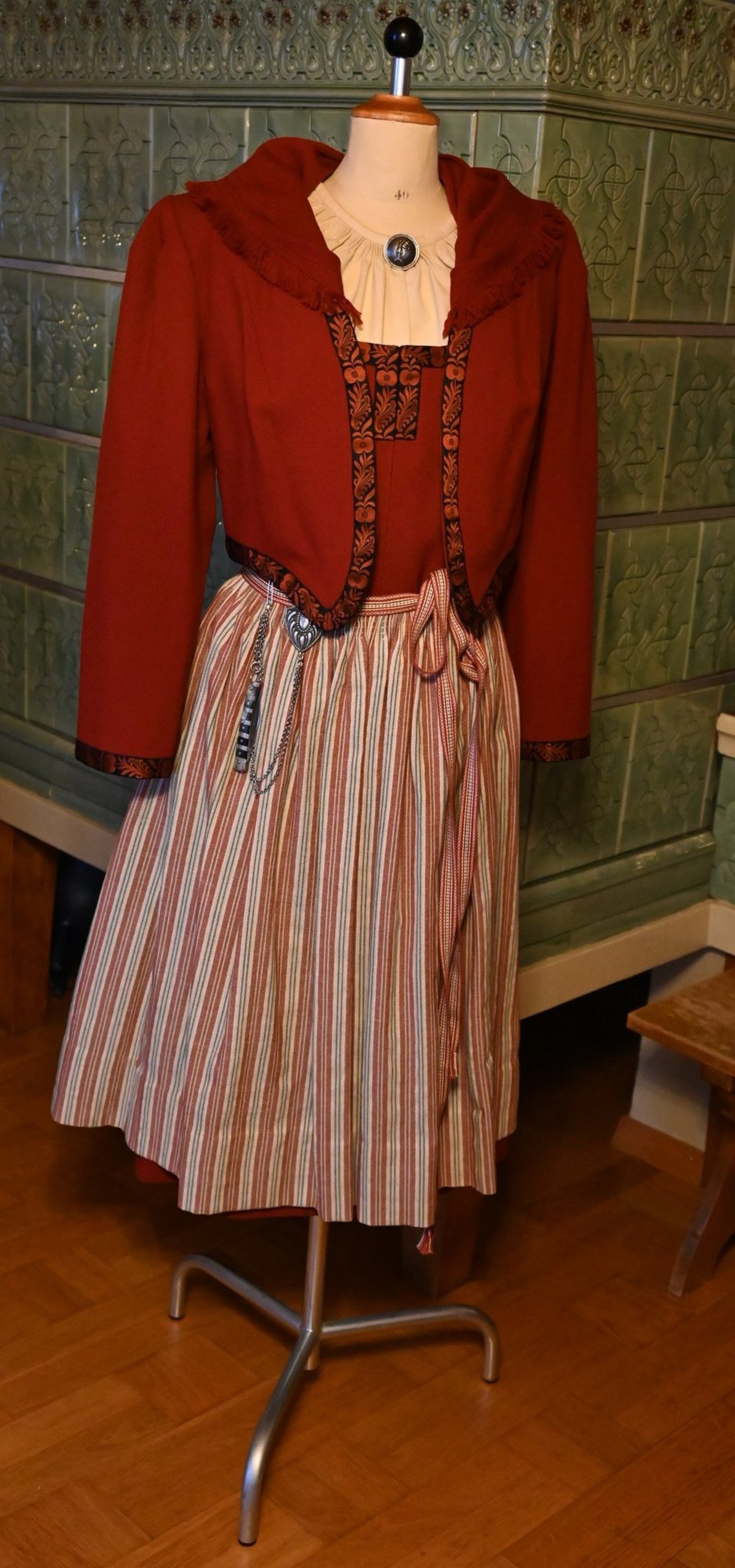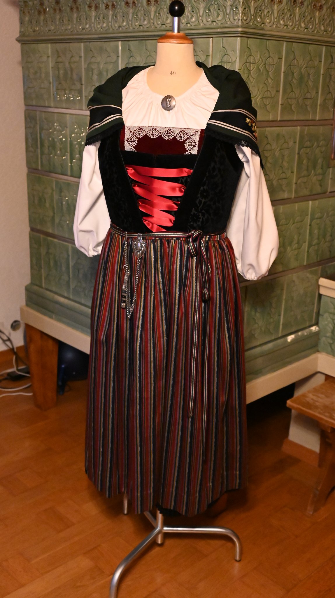 Der Rock besteht aus dem unteren Mieder (Gstältli), dem Brustlatz und der Jippe (Jupe) mit Mieder und Schürband. Der Vorderteil des Gstältli besteht aus schwarzem Press-Samt, der Rückenteil aus Futterstoff. Der Brustlatz ist ein rotes Tuch aus Wollstoff oder Samt und handgeklöppelter Silberfadenspitze. Die Plissée-Jippe besteht aus schwarzer Wolle und Reinleinen. Die Rocklänge ab Boden beträgt 28 bis 30 Zentimeter. Das Mieder aus rot-, blau- oder schwarzem Press-Samt wird an die Jippe genäht. Beim seidenen Schultertuch mit der reichen Seidenstickerei nach bestehenden Vorlagen, stehen die Farben rot, blau grün oder braun zur Wahl.