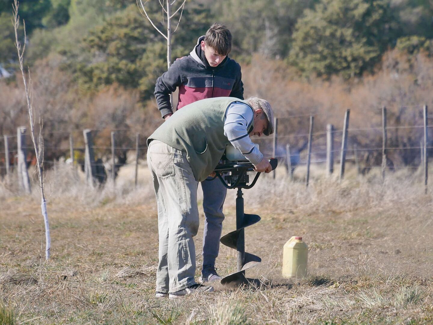 Dank der Hilfe von einigen Freunden der Vorbesitzer, die zu unseren Freunden wurden, schafften wir das Pflanzen der insgesamt 385 Bäume in der Grösse zwischen 1,20 m bis 3 m innert Wochenfrist. Dabei fand ich heraus, dass es am einfachsten ist, zunächst mit dem Lochbohrer auf etwa 25 cm vorzubohren, dann 20 Liter Wasser hineinzuschütten, eine Nacht abzuwarten und dann am darauffolgenden Morgen erneut mit dem Lochbohrer die restlichen 50 cm tief zubohren.