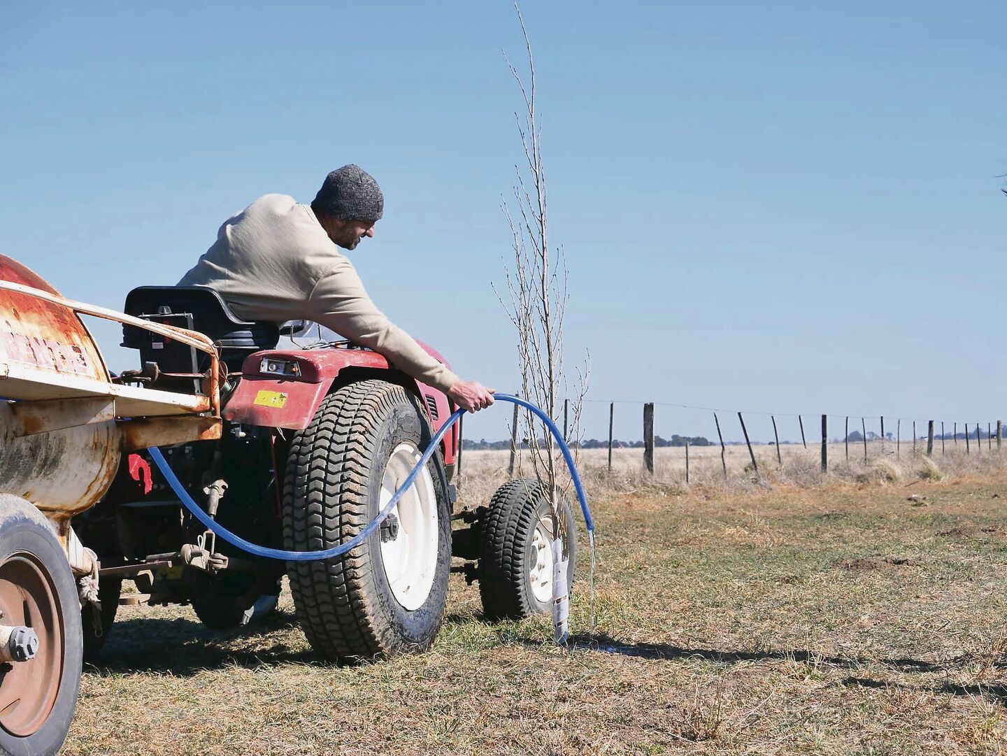 Das Pflanzen war nicht die grösste Arbeit. Diese folgte danach. Die Bäume waren allerlei Bedrohungen durch Blattschneiderameisen, Papageien und Hasen ausgesetzt, was Schutzmassnahmen und Präsenz verlangte. Zudem brauchten die jungen Bäume Wasser und die Lieferung und Installation der Bewässerungsanlage verzögerte sich um mehrere Monate. Dies wussten wir zum Zeitpunkt des Pflanzens nicht. Deshalb hiess es von nun an, zwei Mal pro Woche mit dem Traktor und einem 1500-Liter-Wasserfass die 385 Bäumeeinzeln zu giessen. Etwa fünf Stunden dauert eine solche Rundfahrt.