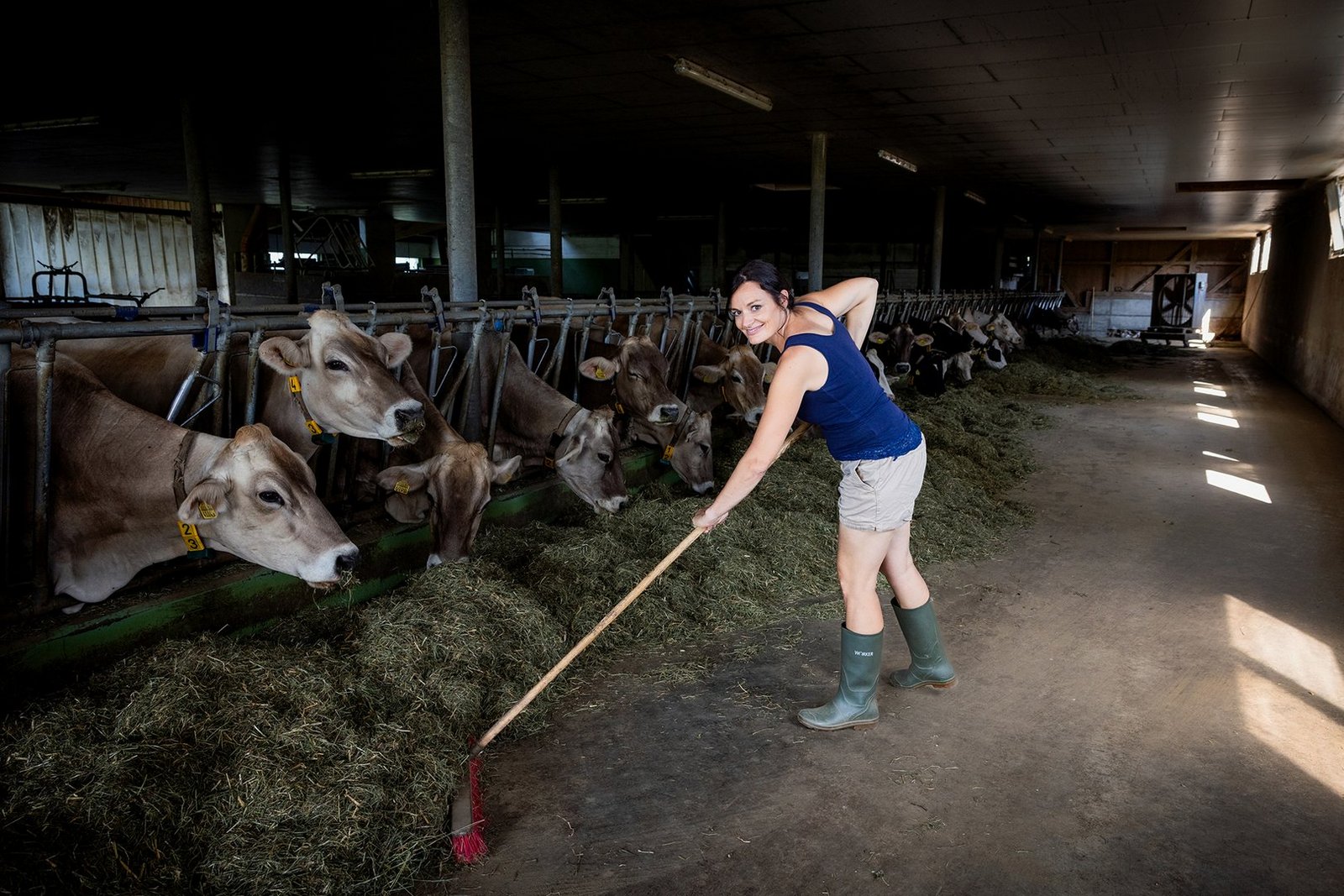 Auch heute gäbe es noch viel zu tun, sagt Irène Meier, doch es sei überschaubarer geworden. Sie kümmert sich auf dem Hof vor allem um die Rinder und die Hühner, hilft bei den Feldarbeiten mit und arbeitet mit ihrem Mann zusammen, wenn die Familie Wochenenddienst hat. «Am Samstag- und Sonntagabend übernehmen die Kinder meinen Helferdienst», erzählt sie. «So verlieren sie den Bezug zum Hof nicht.» Und der Haushalt? Irène Meier lacht: «Der kommt manchmal etwas zu kurz. Gut gibt’s in der Schule Ferien – dann versuche ich nachzuholen, was liegen geblieben ist.»