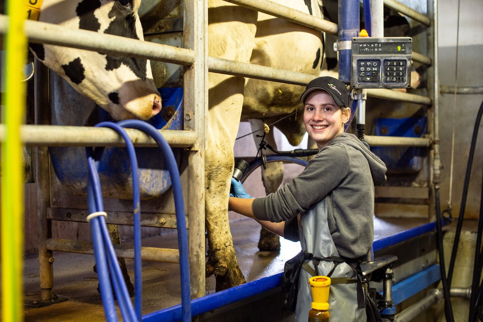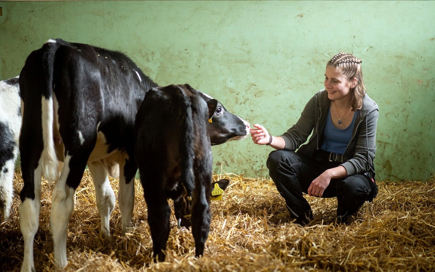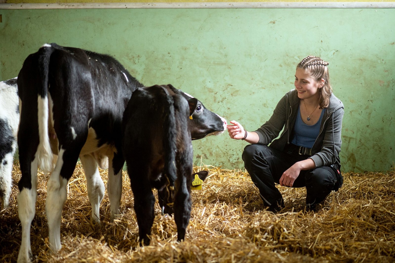Deine liebste Arbeit? Kühe melken und bei den Kälbern einstreuen und deren Lebensfreude beobachten.