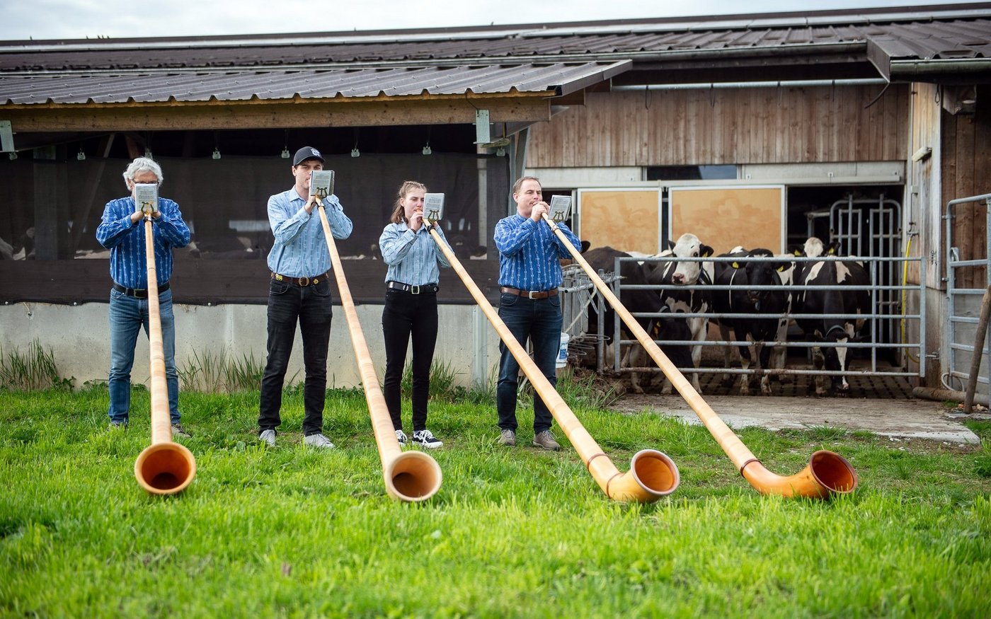 In ihrer Freizeit spielt Jasmin Bariton in der Musikgesellschaft Schongau und zwischendurch Alphorn. Von Letzterem kommen wir – und die Kühe, die sich im Hintergrund neugierig dazu gesellen – in den Genuss eines kleinen Konzerts. Vater Markus, Bruder Livio und ein Freund der Familie, Josef Furrer, und Jasmin spielen zwei Stücke und erfreuen auch vorbeigehende Passanten. Reiten, dabei die Natur zu geniessen und Ausgang dürfen aber auch nicht fehlen.