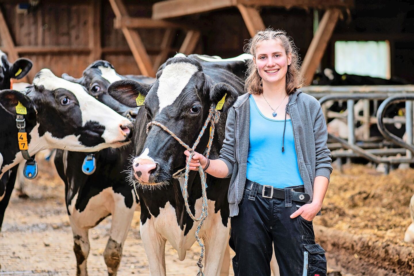 Ruhig, aber bestimmt schickt sie Kühe zur Seite und holt ihr Dream Girl. Dream Girl ist eine hübsche, schwarz-weiss gefleckte Holstein-Kuh. Dream Girl folgt ihr bereitwillig und posiert für die Kamera. Der Name ist Programm, Traum-Mädchen, so heisst es übersetzt, wurde von Jasmin wegen ihres tollen Exterieurs und ihres hübschen Kopfes als Lieblingstier vor Ort ausgewählt. Und natürlich auch der liebe Charakter, erklärt sie schmunzelnd. Sie habe noch mehr Lieblingskühe auf dem Hof, aber die hier sei die hübscheste. Jasmin hatte denn auch als gewünschte Superkraft (siehe Kasten) geantwortet, sie würde gerne mit den Tieren reden können. Eines ist klar: Sie versteht die Tiere bereits; Dream Girl gesellt sich nämlich im Laufe des Interviews zu Jasmin und frisst entspannt, während die künftige Landwirtin unsere Fragen beantwortet. So, als hätte sie verstanden, dass sie sich gerne nochmals zeigen darf, weil sie ja der Liebling ist.
