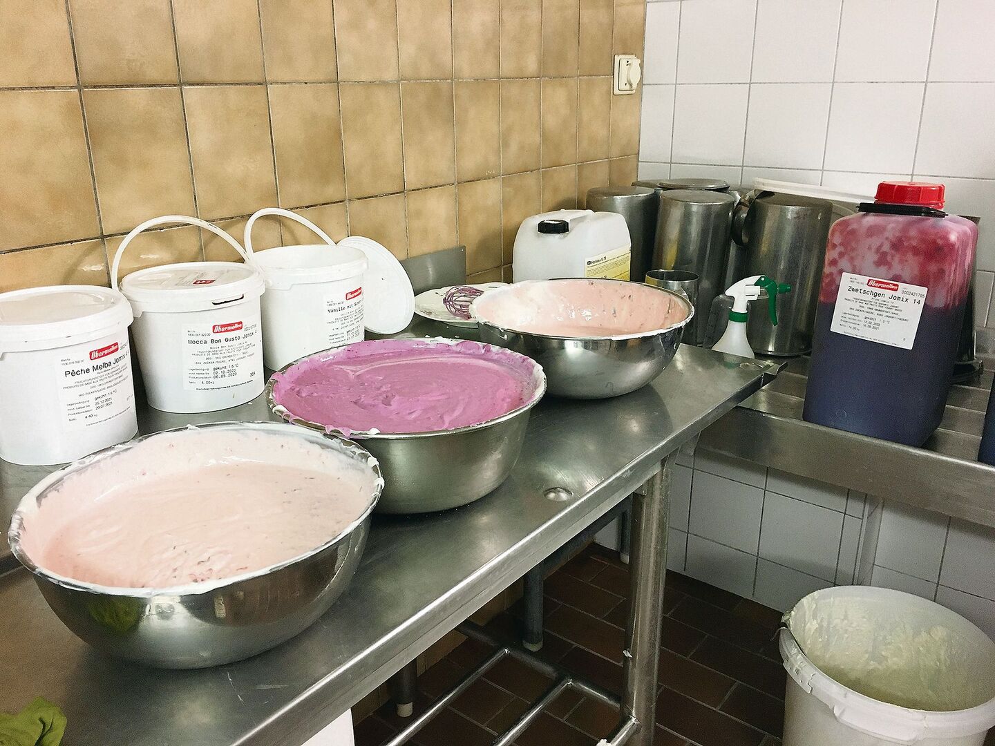 Meine Aufgabe bei der Fabrikation ist es, die verschiedenen Sorten aus Naturjoghurt, Fruchtkonzentraten und Zucker anzurühren. Meine Chefin leert das Joghurt anschliessend in den Trichter und die Maschine füllt die Becher damit. Sie legt die passenden Deckel darauf, welche danach mit dem Becher verschweisst werden. Ophélie, die Lehrtochter, befestigt dann das Datum an die fertigen Becher und verteilt sie in die Kisten für die Kunden. Normalerweise stellen wir jeden Dienstag um die 500 Joghurts her. Kurz vor dem «Zmittag» wird alles aufgeräumt, bis es dann am folgenden Dienstag weitergeht.