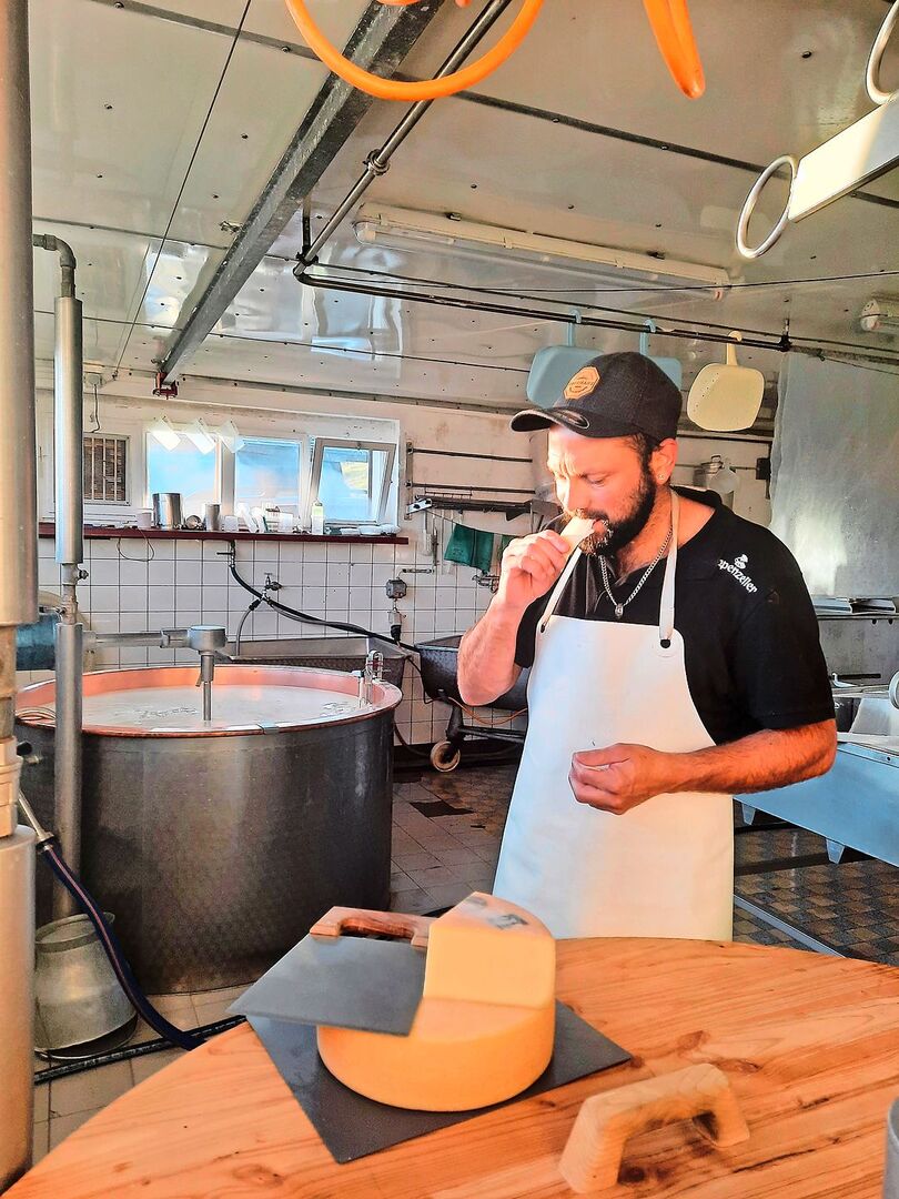 Senn Reto holt einen Käselaib vom ersten Produktionstag aus dem Keller und schneidet den Laib an. Keine Löcher sind zu sehen, saubere Arbeit! Mild, aber nicht quietschend und mit ein bisschen Fantasie schmeckt man die zarten Alpenkräuter unserer Weiden heraus.