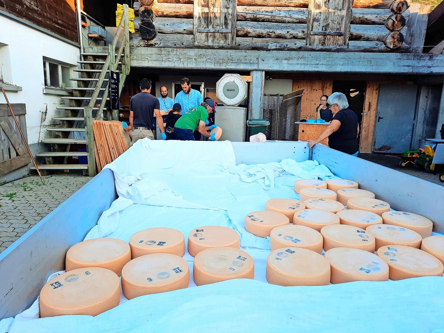 Der Keller auf Valpun reicht nicht für den ganzen Sommer, daher kommen die Bauernfamilien an unsere erste «Chästeilete». Reto und Andreas bringen die vollen Käsebretter nach draussen. Der Alpvorstand wägt und verteilt die Laibe möglichst gerecht an die Bauernfamilien.