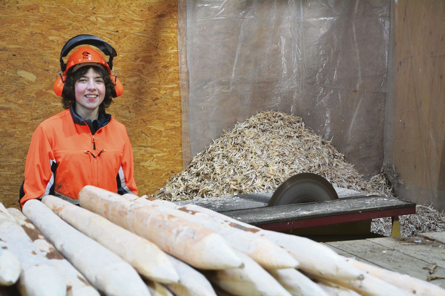 Das Passende wird anschliessend zu Zaunpfählen verarbeitet. Aus Fichtenholz gibt es besonders gute Pfähle. Sie werden «geschintet» und gespitzt, diese Arbeit darf ich machen. Mit dem Schälblatt, welches auf die Holzfräse montiert wurde, werden die Pfähle gemacht. Damit das «Schinten» problemlos geht, wurde das Schälblatt zusätzlich geschärft. Wichtig ist, dass ich die Pfähle sauber «schinte», damit Würmer nicht in die Rinde gelangen. Das gelingt mit genug Druck gegen das Schälblatt. Am gröberen Teil wird der Pfahl gespitzt, dabei ist zu beachten, dass die Spitze gleichmässig gemacht wird. Sonst geht das Einschlagen nicht gut. Am oberen Teil wird die Spitze noch abgerundet, so spaltet der Pfahl beim Einschlagen nicht.