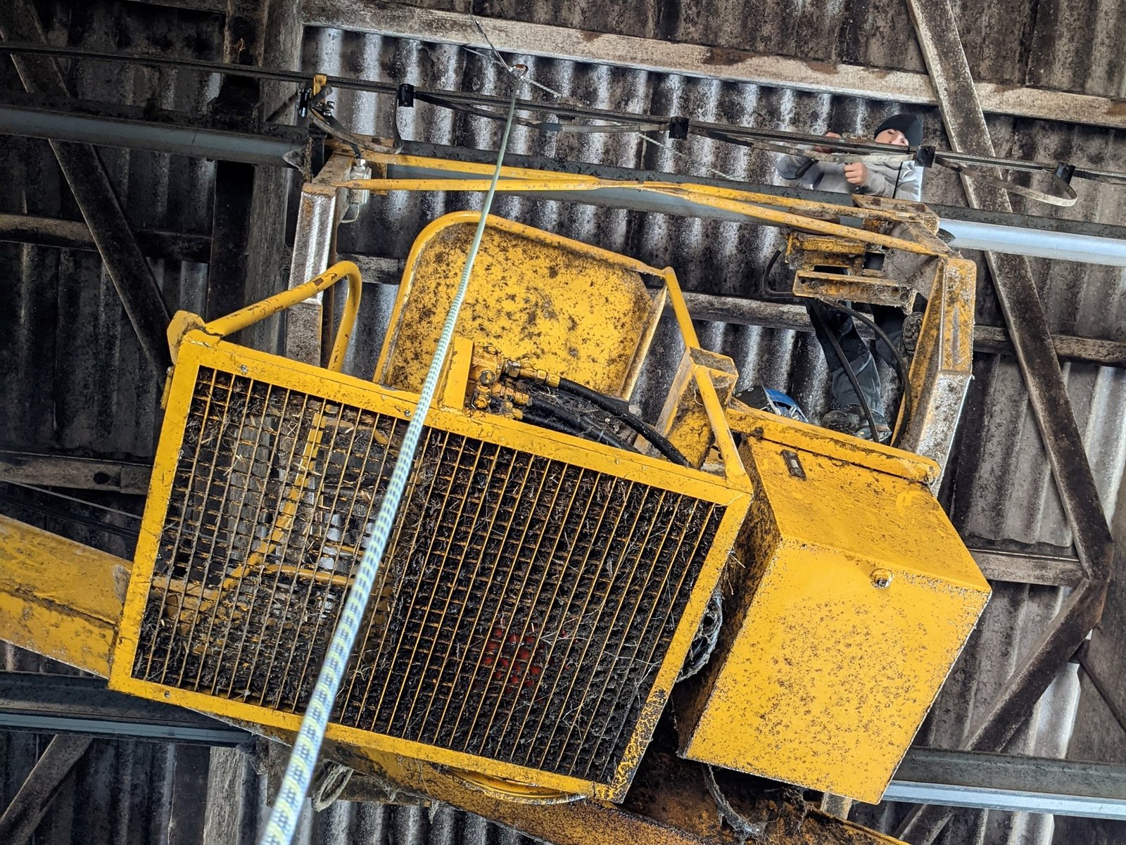 Diese Arbeit brachte mich einmal mehr in ein ganz neues Aufgabengebiet: Hätte mir jemand beim Antritt meiner Lehre gesagt, dass ich hier wie beim Bergsteigen jemanden an einem Seil sichern werde, hätte ich vermutlich gelacht und den Kopf geschüttelt. Und doch stand ich an jenem Morgen im Stall mit einem «Klettergstältli», einem Karabinerhaken und einer Bremsrolle, durch die das Seil führte, an welchem der Sohn des Chefs angemacht war und gab mein Bestes, dass er auch oben blieb. Durch seine geschickten Griffe und guten Fertigkeiten des Schrauben lösens und wieder anziehen, war die ganze Sache eine erstaunlich kurze Übung und so fährt das Kabel nun wieder schön auf einer geraden Schiene neben dem Kran her.