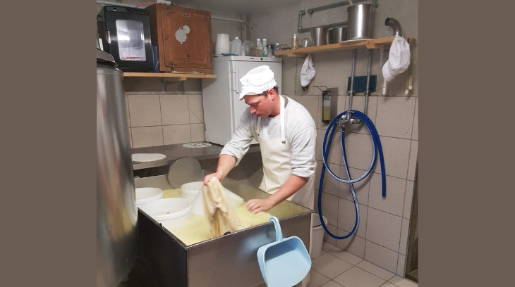 Nach dem Melken am Morgen kommen die Kälber dazu und verbringen den Tag mit den Kühen im Stall oder auf der Weide. Abends werden die Kühe und ihre Kälber dann wieder getrennt. So könnenwir die Kühe morgens gut melken. Die Milch verkäsen wir alle zwei Tage selbst und vermarkten den Käse direkt. Für mich ist das Käsen eine besonders spannende Arbeit. Wenn ich am Morgen in die Käserei komme, fülle ich als erstes die Milch vom Tank ins «Käsekessi». Nebenbei messe ich die Käsekultur, welche wir selbst nachnehmen. Danach erwärme ich die Milch. Bei 25 Grad wird ein Teil der Kultur «vorgeschüttet». Sobald fertig gemolken ist, wird eingelabt.