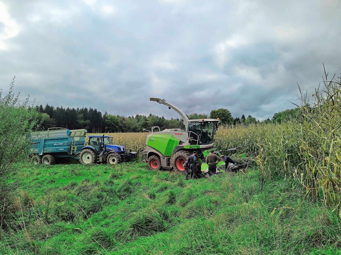 Mit einem nasskalten Start im Frühling verzögerte sich das gesamte Wachstum. Als es dann endlich warm wurde, erwischten wir ein übles Unwetter mit Hagel, der alle vorhanden Blätter zerschlug. Trotzdem kam der Mais dann um den 1. August herum doch noch in die Fahne. Und als die Körner zu schwellen begannen, bedienten sich Dachs, Hirsch und Wildschwein ungeniert direkt ab unserem Feld. Zum krönenden Abschluss hatte auch noch der Häcksler eine Panne.