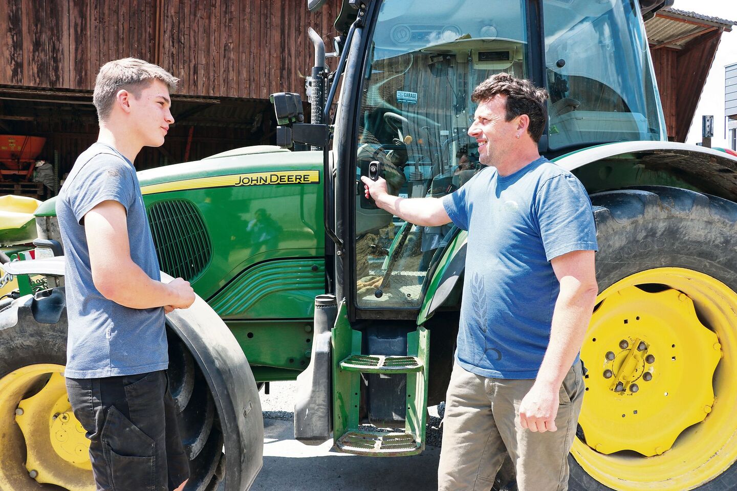 Rund die Hälfte der Milch wird von der Kundschaft am Selbstbedienungsautomaten gezapft, der Rest geht an Emmi. Nach der Stallarbeit gibt der Ackerbau auf dem 54-Hektaren-Betrieb zu tun. Eine ideale Kombination für Lino Wiederkehr. Er schätzt Abwechslung bei der Arbeit, und noch ein bisschen lieber als Kühe mag er Traktoren. Den Umgang mit Tieren und Maschinen musste er lernen. Er ist nicht auf einem Bauernhof aufgewachsen, aber die Landwirtschaft hat ihn seit Kindheit fasziniert, nach dem Schnuppern war sein Berufswunsch definitiv klar. Er habe schnell gelernt, sagt Berufsbildner Gysi über seinen Lernenden, aber natürlich habe man aufbauen müssen. Zum Beispiel das Traktorfahren. Der Betrieb steht mitten in Buchs, die Stadt Aarau ist nahe und der Verkehr dicht, «da konnte ich ihn nicht einfach mit den grossen Maschinen auf die Strasse schicken.» Mittlerweile überlässt er ihm den Traktor unbesorgt auch mit dem 3,5-Meter-Frontmähwerk.