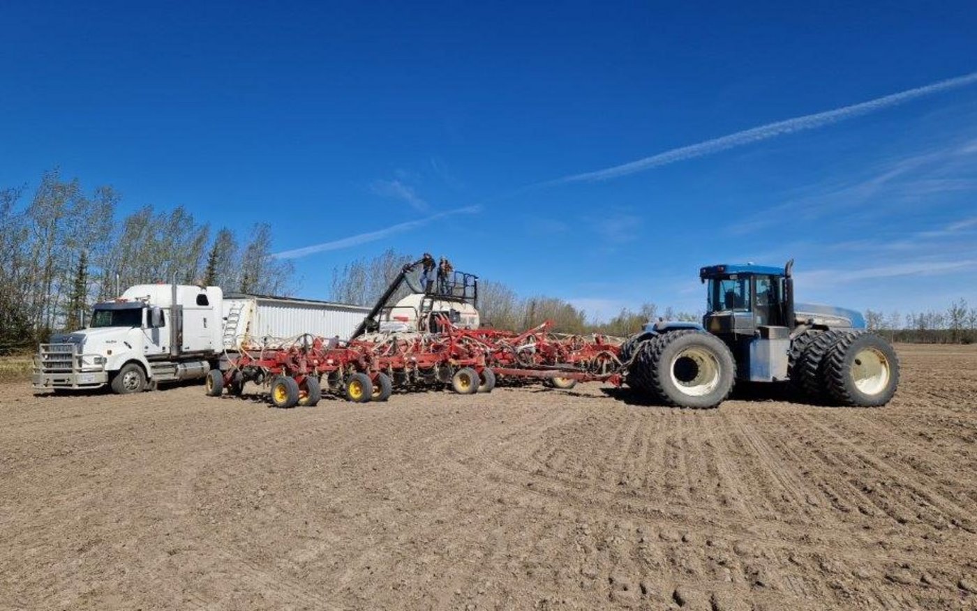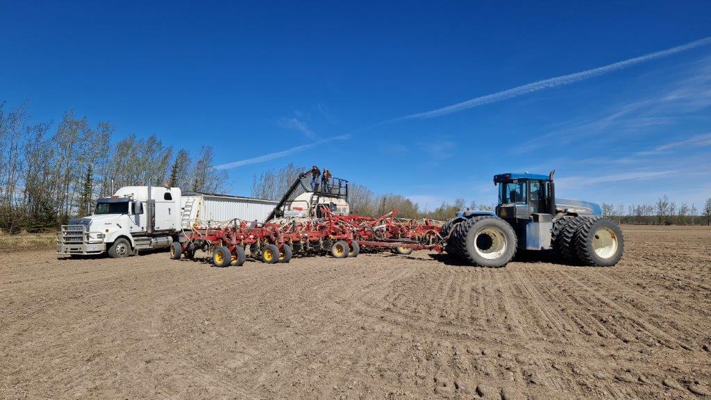 7. Mai 2024: Heute erlebe ich Geschichte: Ich stehe neben meinem Bruder Fred Lehmann und seiner Tochter Alexandra auf dem «Dach» der Burgoult-Sämaschine. Beide sind daran, Dünger mit der Schnecke aus dem Freightliner-Lastwagen zu laden.