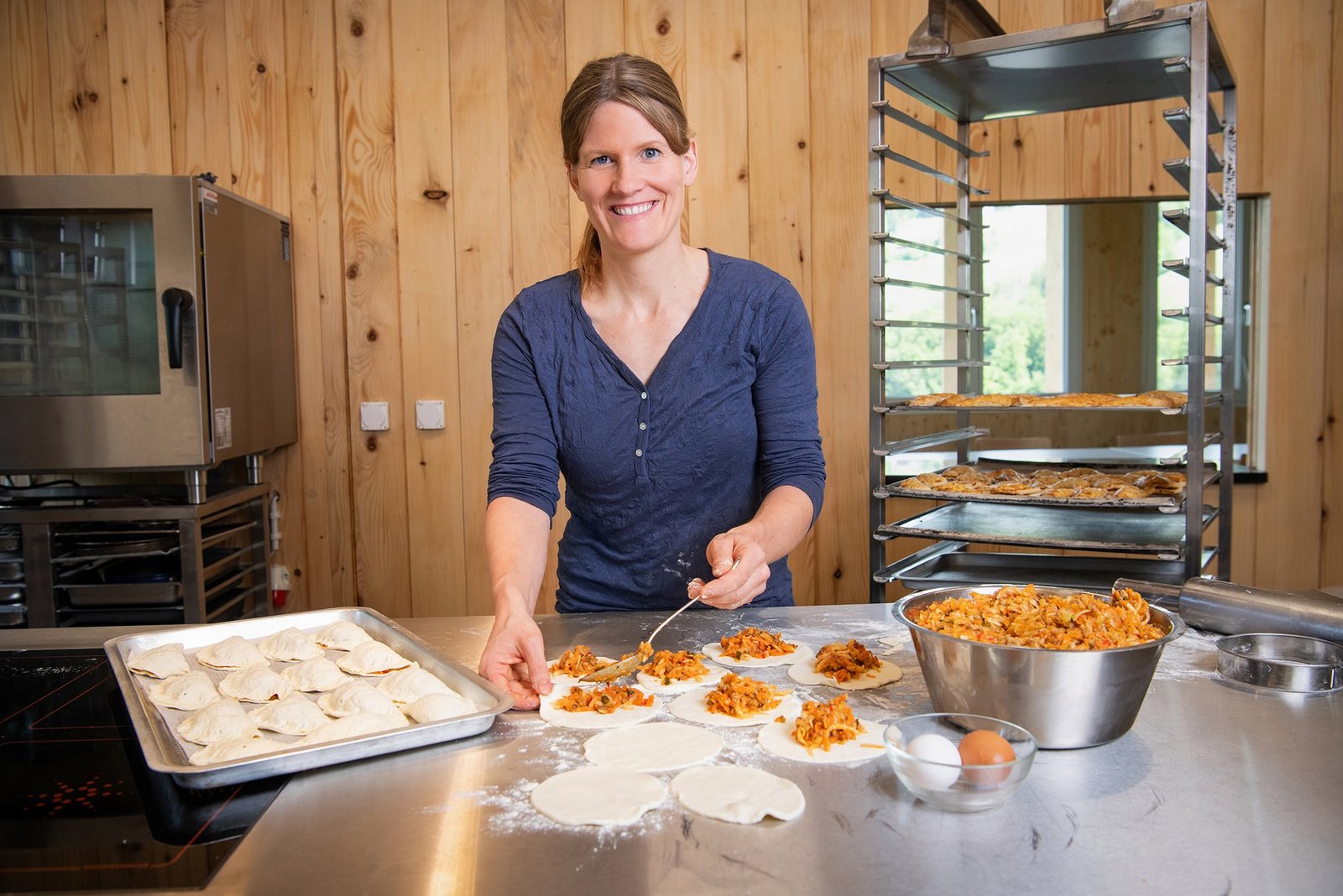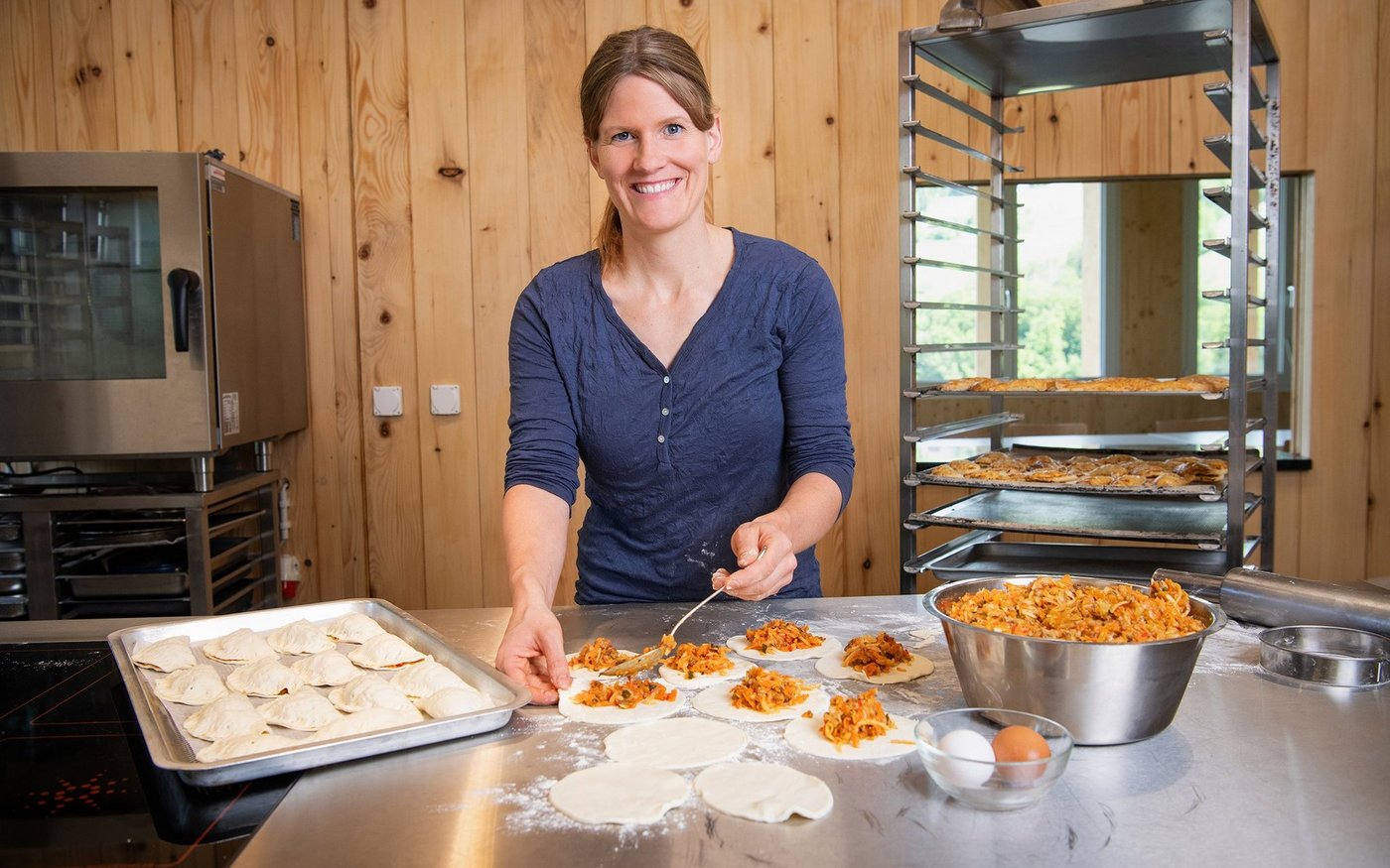 Das Kochen zusammen mit einer Kinderschar und auch für Gesellschaften gestaltet sich seit diesem Frühling für Melanie Ramser viel einfacher. Die Familie konnte nach zweijähriger Bewilligungsphase einen grösseren Gastraum mitsamt Gastroküche an ihr Bauernhaus anbauen. In dieser Küche verbringt die Bäuerin, die heuer Teilnehmerin der Landfrauenküche ist, viel Zeit. Sie kocht gerne und das am liebsten für viele Leute. «Wenn schon, denn schon», erklärt sie im Interview und lacht dabei. Täglich sitzen mindestens acht hungrige Mäuler am Tisch. «Kochen ist für mich Erholung», erklärt die dreifache Mutter. Oftmals kocht sie auch grössere Mengen vor und friert sie ein, um an Tagen darauf zurückzugreifen, an denen nicht viel Zeit zum Kochen bleibt. Immer ist ihr jedoch eine gesunde, ausgewogene, regionale Küche ohne Fertigprodukte wichtig.