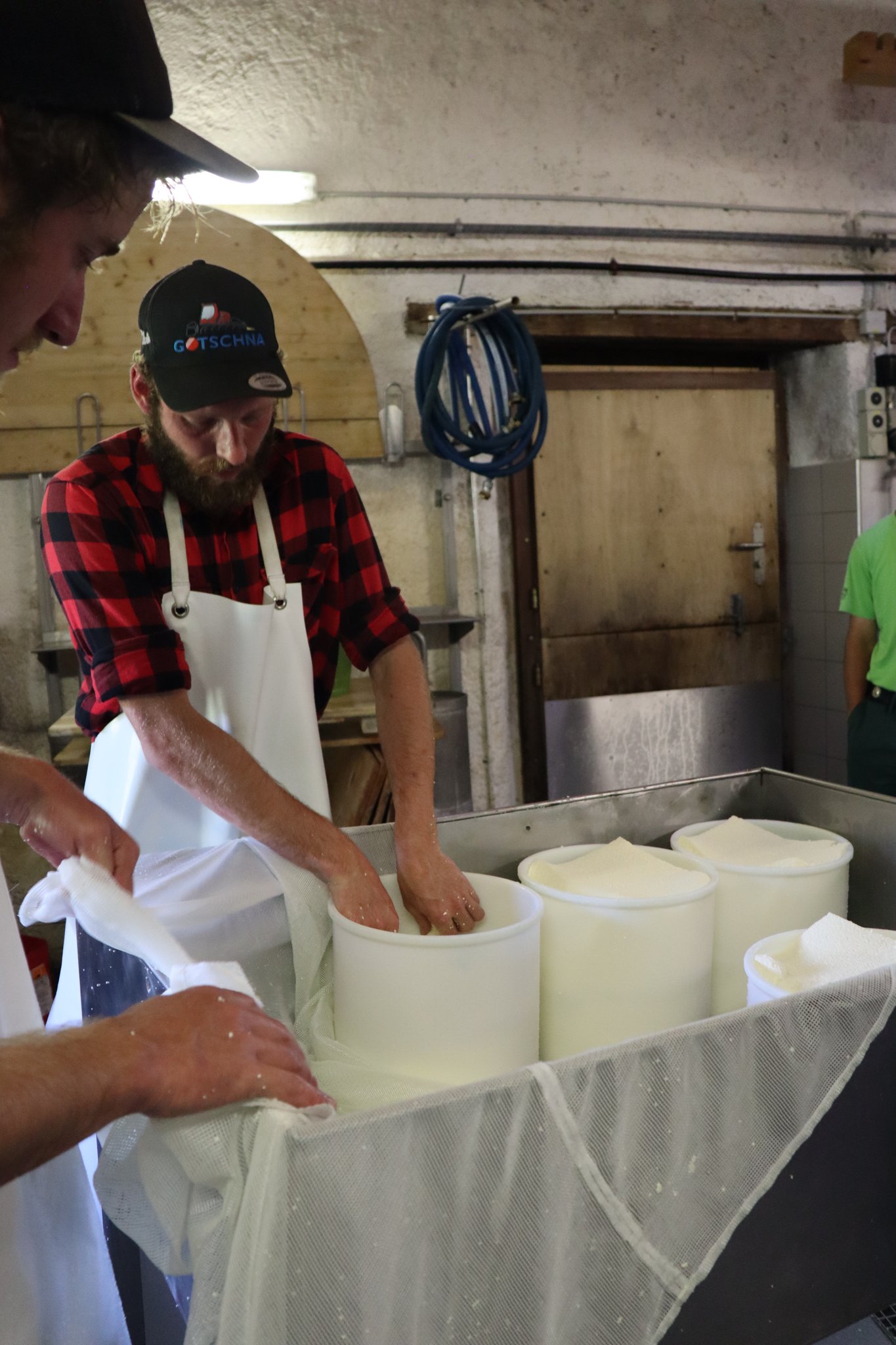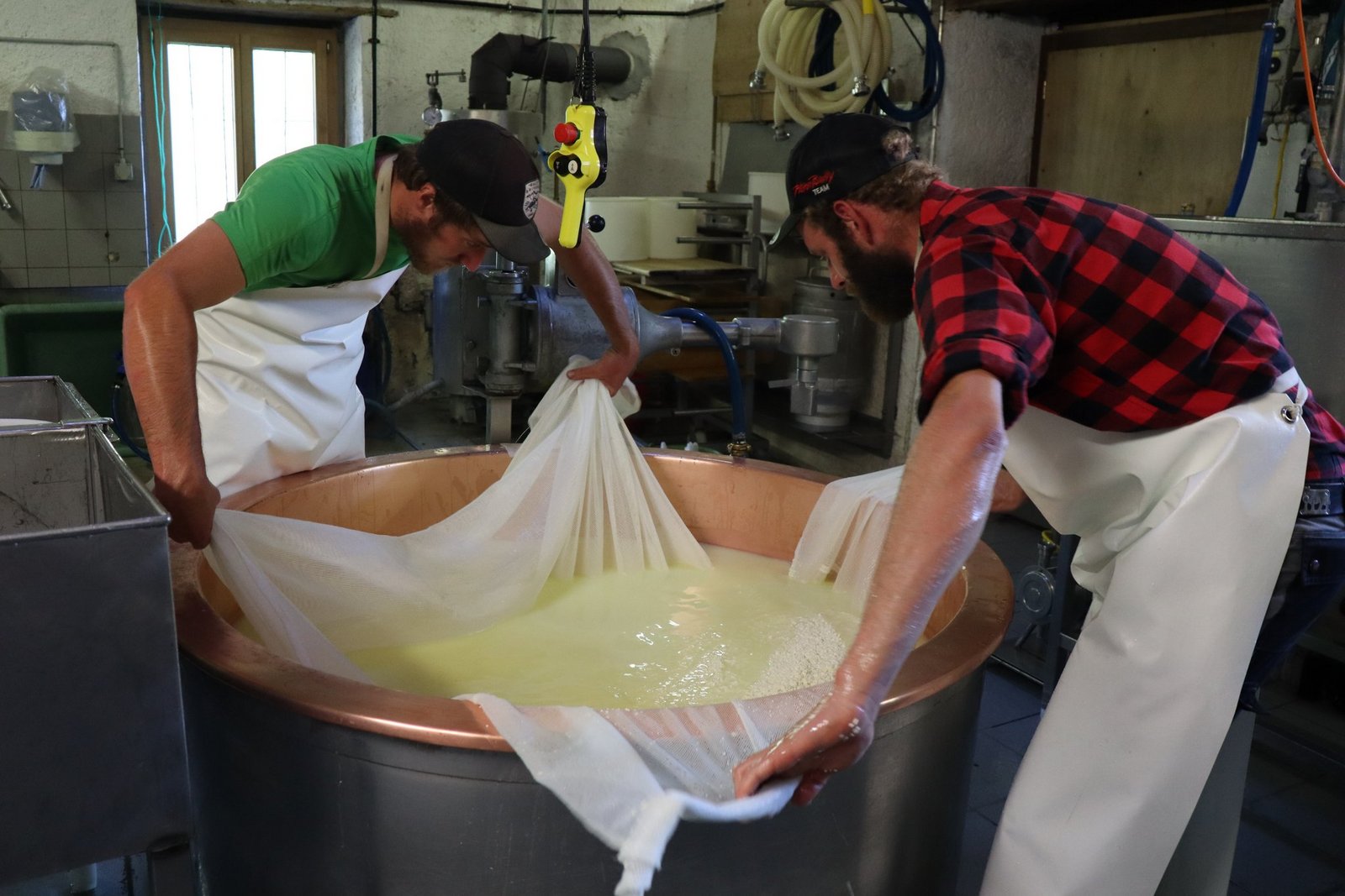 Dann wird es Zeit, die Käsemasse aus dem Käsekessi zu ziehen. Dafür braucht Senn Tobias Schaad die Hilfe seines Kollegen Thomas Marti. Gemeinsam ziehen sie vorsichtig die Masse aus dem Käsekessi und bringen sie mittels eines Aufzugkrans in die Vorpresswanne. Hier lassen sie die Masse etwas ruhen, sich verfestigen, dann wird sie geschnitten und vorsichtig in die Käseformen gebracht. Es gibt jeweils zwei Käselaibe pro Form.