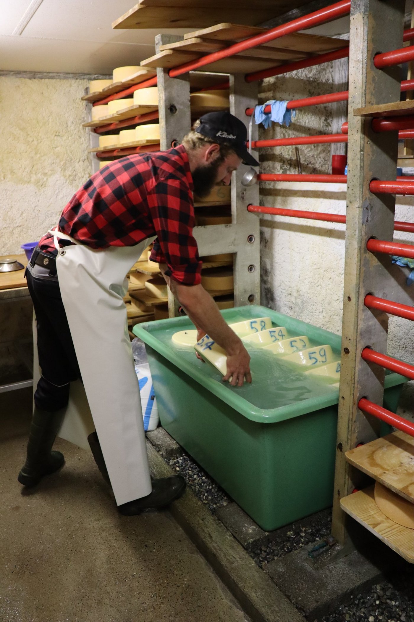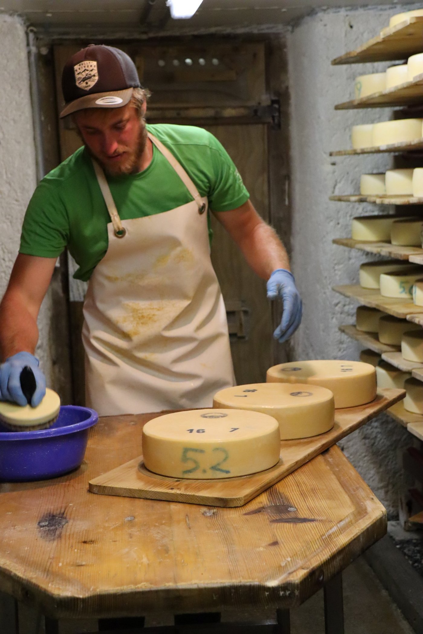 Die Alpkäse der vorhergehenden Produktion werden in der Zeit, in welcher die Milch erwärmt wird, aus den Formen genommen, gewogen und die Kanten mit einem speziellen Messer gebrochen. Diese «Käseschwänze» können selbst gegessen werden – oder aber der Hund oder die Hühner freuen sich über die Delikatesse. Pro Tag werden fürs Käsen rund fünf Stunden benötigt. Doch nicht nur die Produktion braucht Zeit. Die Käse müssen auch täglich gepflegt werden, nochmals etwa zwei Stunden, damit sie gut und gleichmässig reifen können und eine schöne Rinde bekommen. [IMG 5]