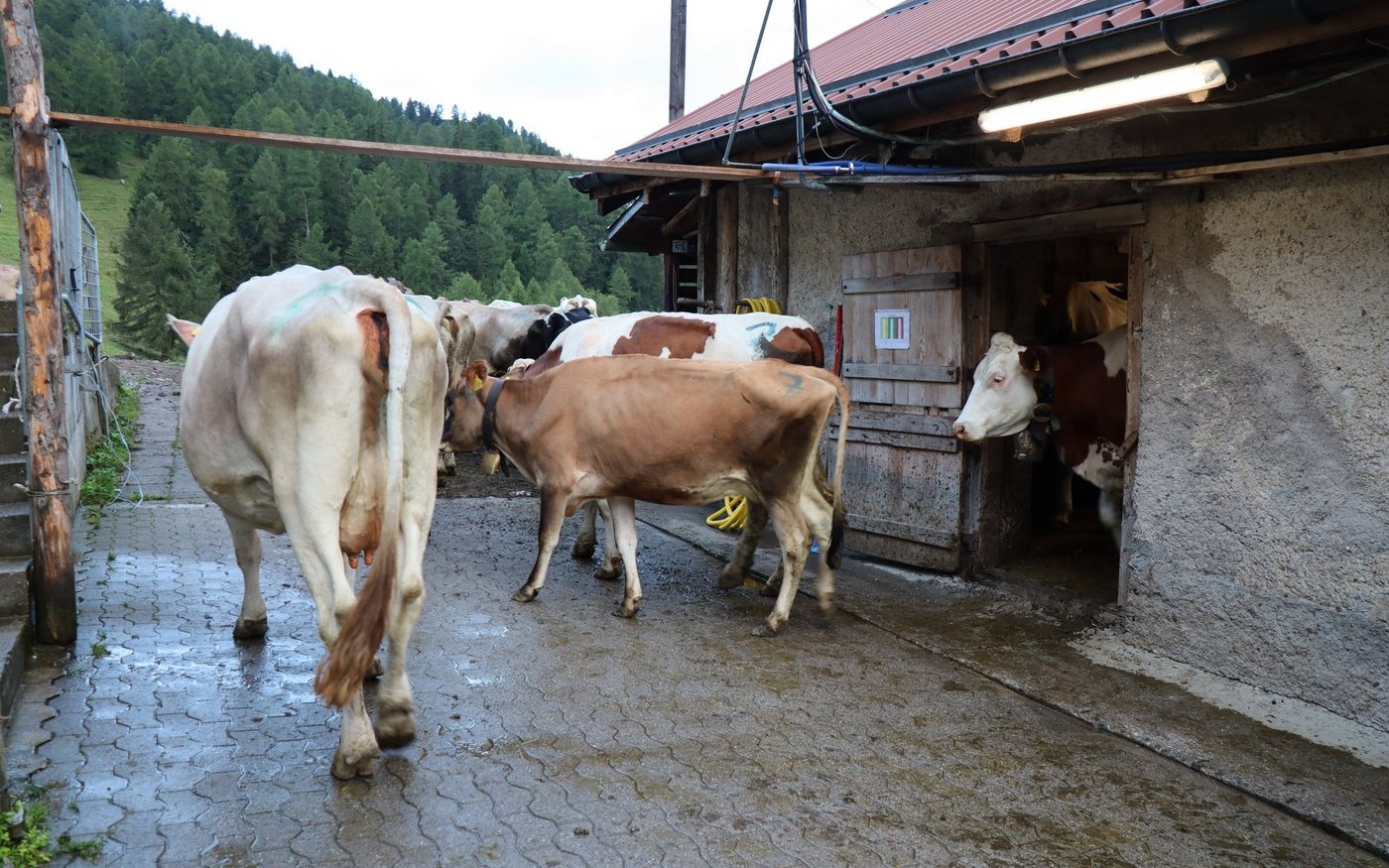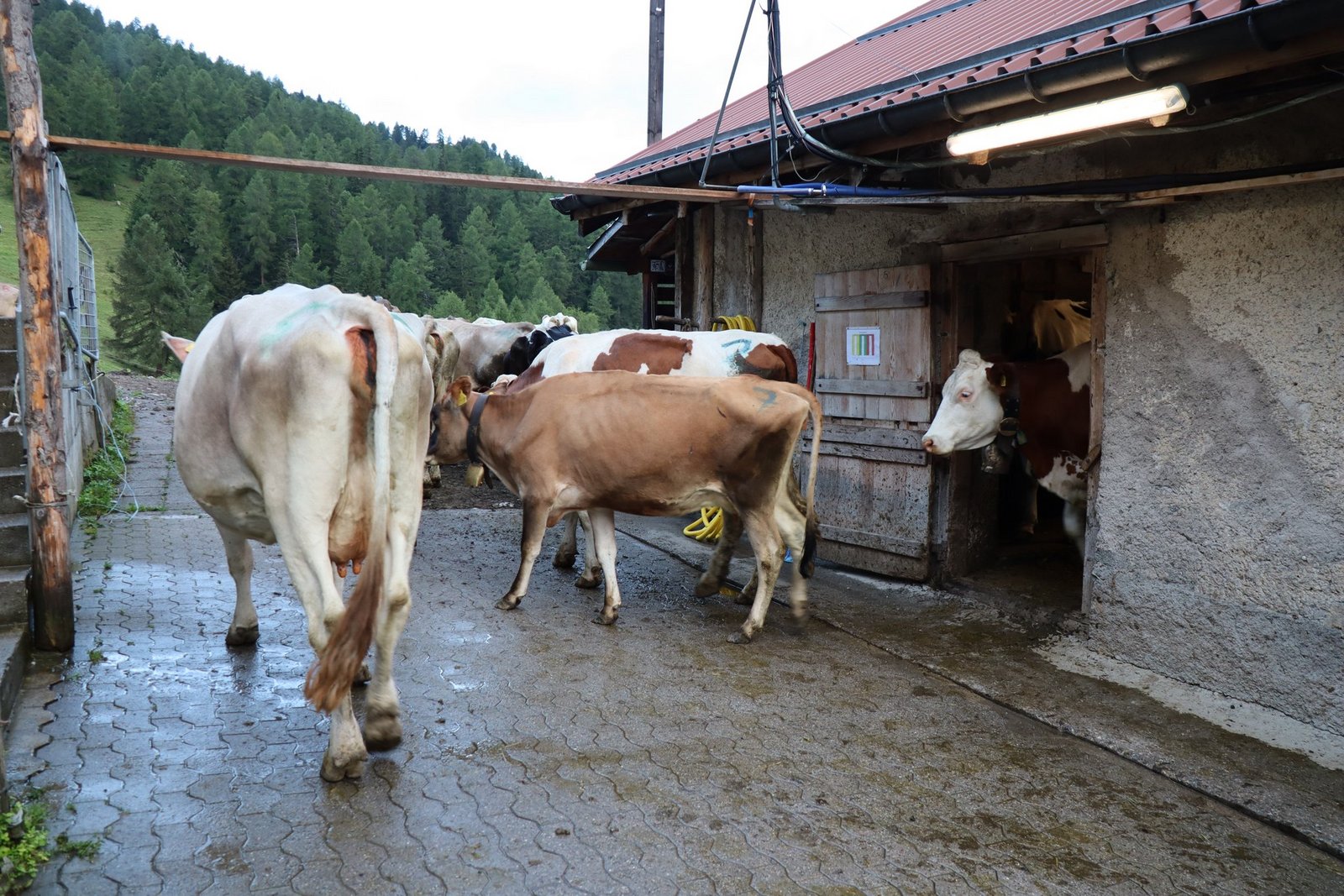 Täglich kontrollieren Tobias Schaad und Thomas Marti die Kühe. Die laktierenden Kühe werden morgens um 5 Uhr von der Nachtweide in den Stall geholt. In der Krippe liegt etwas Heu, so dass die Kühe jeweils gerne zum Stall kommen und sich anbinden lassen. Die meisten Kühe kommen aus Freilaufställen und es ist anfangs Alpsaison nicht selbstverständlich, dass sie sich ohne Weiteres anbinden lassen. Inzwischen weiss auf der Alp Ozur aber jede Kuh, wo ihr Platz ist, und geht beim Einstallen direkt dorthin. Nach dem Melken und einer Ruhepause werden sie wieder auf die Tagweiden gelassen, welche zum Teil über einen längeren Marsch erreicht werden.