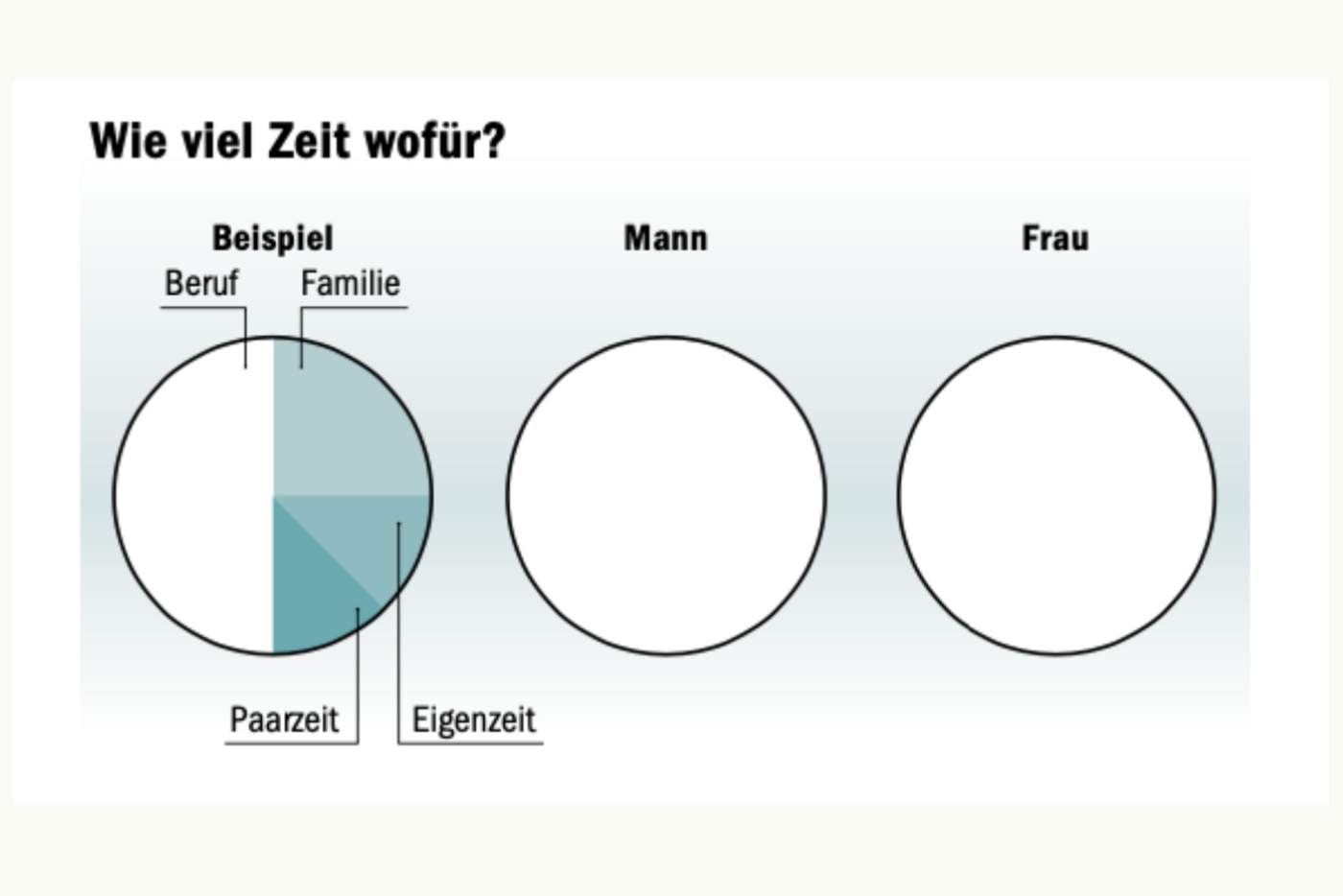 Laden Sie Ihren Mann zu einer Diskussionsrunde ein. Als Erstes ziehen Sie die Schlafzeit ab. Bei 7 h Schlaf erhalten Sie zum Beispiel 119 h verfügbare Zeit pro Woche. Nun verteilen Sie diese 119 h auf die «Kuchenstücke», die im Bild zu sehen sind: Beruf, Familie, Paarzeit und Eigenzeit. Führen Sie vorgängig eine klärende Diskussion, was in welches Kuchenstück gehört.
