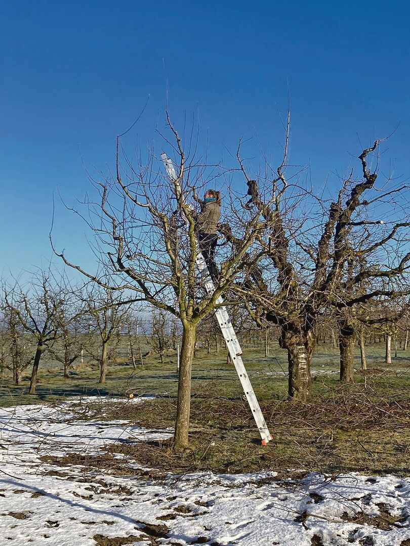 Etwas Schnee lag noch in der Obstplantage, als mein Chef und ich die Leitern zum ersten Baum trugen. Die Bise erschwerte uns die Arbeit. Sie war in den letzten Tagen unerbittlich kalt und zog uns um die Ohren. Gut, dass Arbeiten warm gibt.