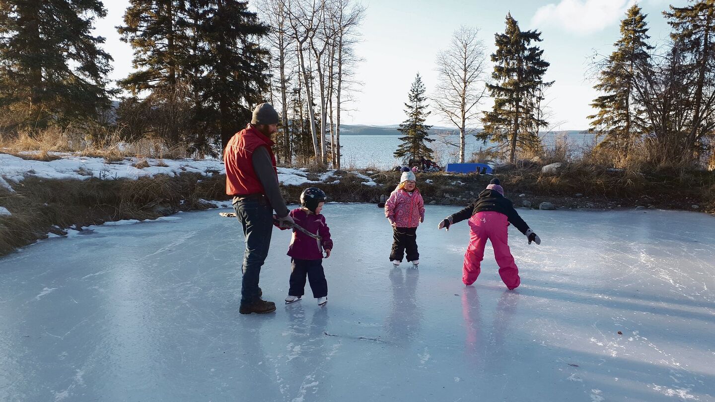 Schlittschuhlaufen ging auf dem See leider nicht, da er extrem unregelmässig zufror. Die Oberfläche war nicht glatt genug, um mit den Schlittschuhen darauf zu fahren. Glücklicherweise gibt es hier aber zwei kleinere Weiher auf der Ranch und so konnten wir zumindest dort mit den Kindern Eislaufen. Auch Schlittenfahren kann man am Hang zum See hinunter gut. Der Winter lässt sich hier draussen trotz der Einsamkeit und der kalten Temperaturen also nicht schlecht aushalten.