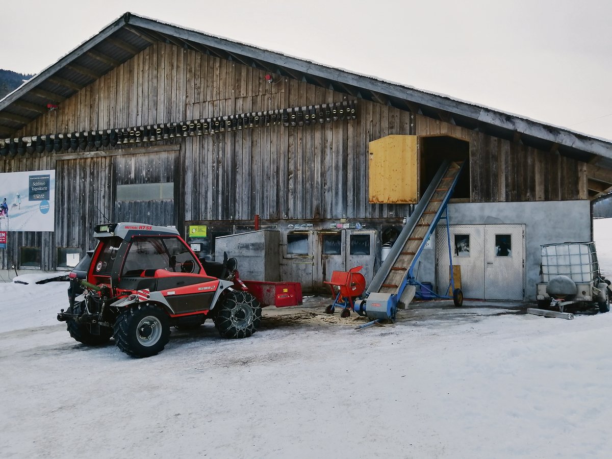 Wir gingen wieder zur Holzbeige an der Saane und mein Chef belud mit dem Holzkran den Kipper des Mulis mit meterlangem Brennholz. Ich lud währenddessen Brennholz mit der Kippschaufel des Metrac. Weiter ging die Geschichte: Thomas reichte David jeweils neues Holz, David fräste es und warf es auf das Förderband. Ich verteilte es dann oben im Holzschopf, damit es das Förderband nicht blockierte.