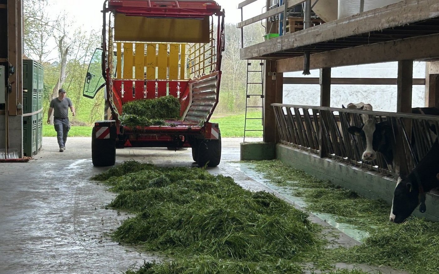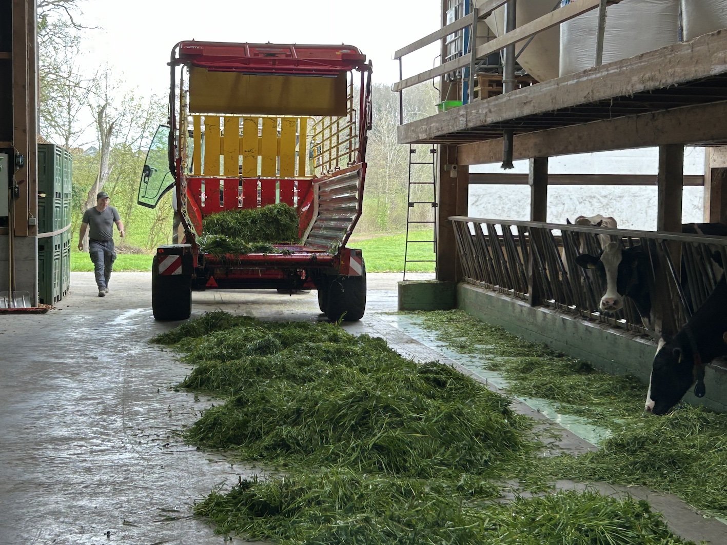 Tobias Keller ist sportlich unterwegs. Flink springt er vom Traktor und klettert die Leiter zum Heuboden hoch, um das Futter für die Milchkühe in den Mischwagen zu schaufeln. Es ist ihm anzusehen, dass ihm sein Lehrlings­alltag Freude macht. «Früher hat mich der Bauernberuf eher abgeschreckt, weil er mit so viel Arbeit verbunden ist und so wenig Freizeit übrig bleibt», sagt Tobias Keller. Während seiner ersten Lehre als Zimmermann war der Wunsch dann doch aufgekommen, in die Fussstapfen seines Vaters zu treten. Daher hängte er anschliessend die Zweitausbildung zum Landwirt an, aktuell ist der 22-Jährige im dritten Lehrjahr bei Martin Müller im Weiler Löwenhaus bei Kümmertshausen TG.