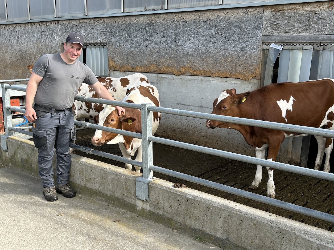 Am Lehrbetrieb, der auf ­einer Ebene in der Nähe vom Bodensee liegt, gefällt Tobias Keller die Kombination der verschiedenen Bereiche: Es gibt hier Milchwirtschaft, Acker- und Futterbau ­sowie mehrere Obstanlagen. Acker- und Obstbau sind ihm bereits von seinem elterlichen Betrieb, zu dem auch eine Pouletmast gehört, im wenigen Kilometer entfernten Opfershofen TG vertraut. Dass er nun mit Kühen und Kälbern arbeiten kann, weiss der Lehrling zu schätzen: «Um diese Tiere herum bin ich besonders gern.»