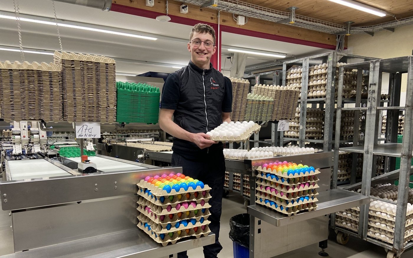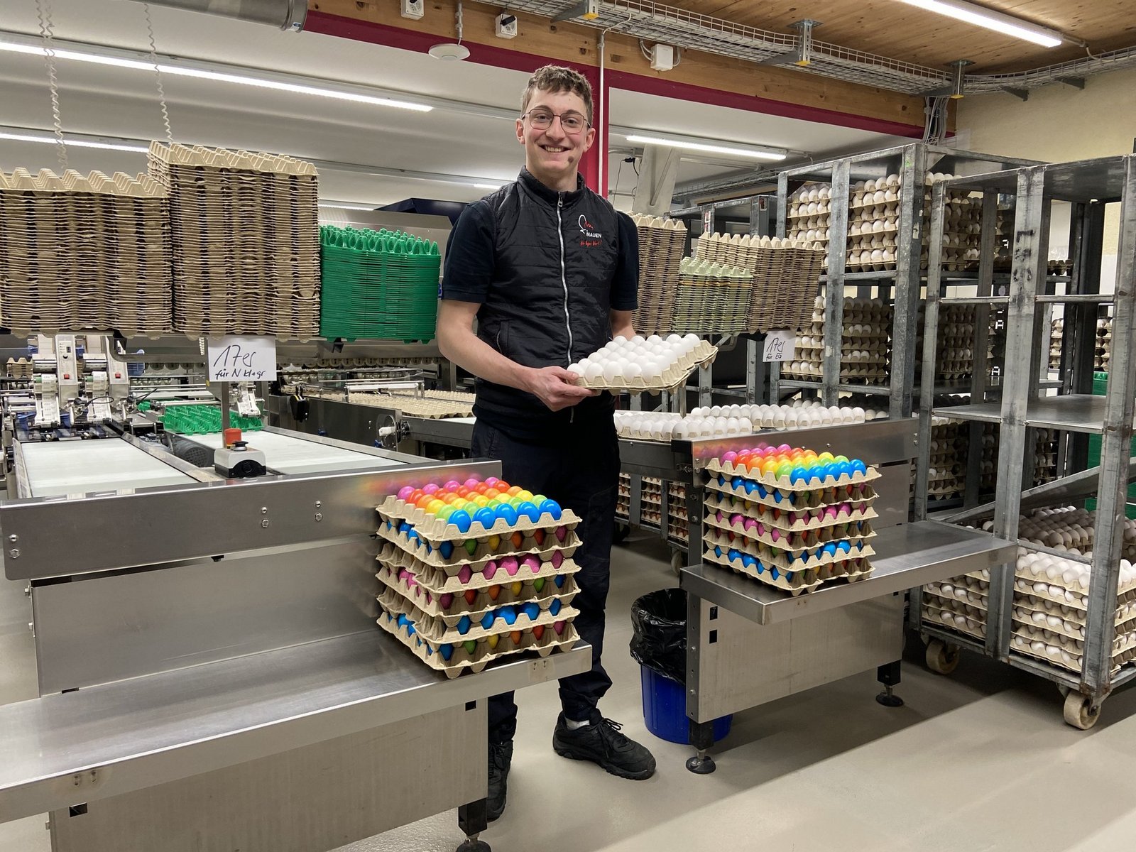 «Unser Betrieb ist auf maximales Tierwohl und hohe Arbeitseffizienz ausgelegt», sagt Tobias Meierhofer, nachdem er die modernen Maschinen und Gerätschaften erklärt hat. «Früher hätten wir das Ei 25'000x in die Hand genommen, pflegt mein Chef zu sagen, heute sind es noch etwa vier Arbeitsschritte zwischen Stall und Endkunde.»