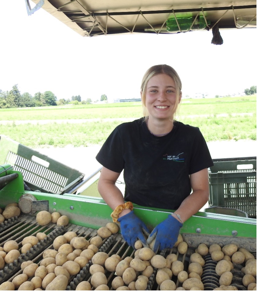 Vor allem bei den Lagerkartoffeln in den mittelschweren Böden haben wir auf der Erntemaschine viele Erdknollen zu erlesen. Mit der vorgängigen Bewässerung können wir den Kartoffeldamm an der Oberfläche aufweichen, es erleichtert die Ernte und schont die Kartoffeln. Auf der Erntemaschine trennen wir die Kartoffeln von Erdknollen, Steinen, faulen, unförmigen und mangelhaften Kartoffeln. Um die Nahrungsmittelverschwendung möglichst gering zu halten, werden die unförmigen und zu grossen Kartoffeln aussortiert und an gewisse Läden und Grossküchen geliefert. Bei der Ernte ist der Lehrmeister immer mit auf dem Kartoffelvollernter und die Lernenden fahren abwechslungsweise den Traktor.
