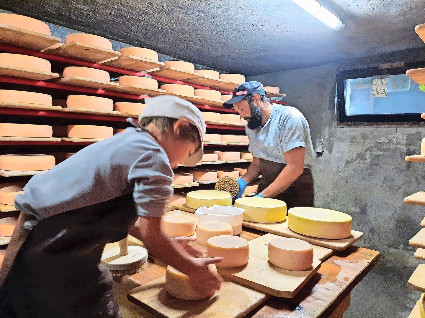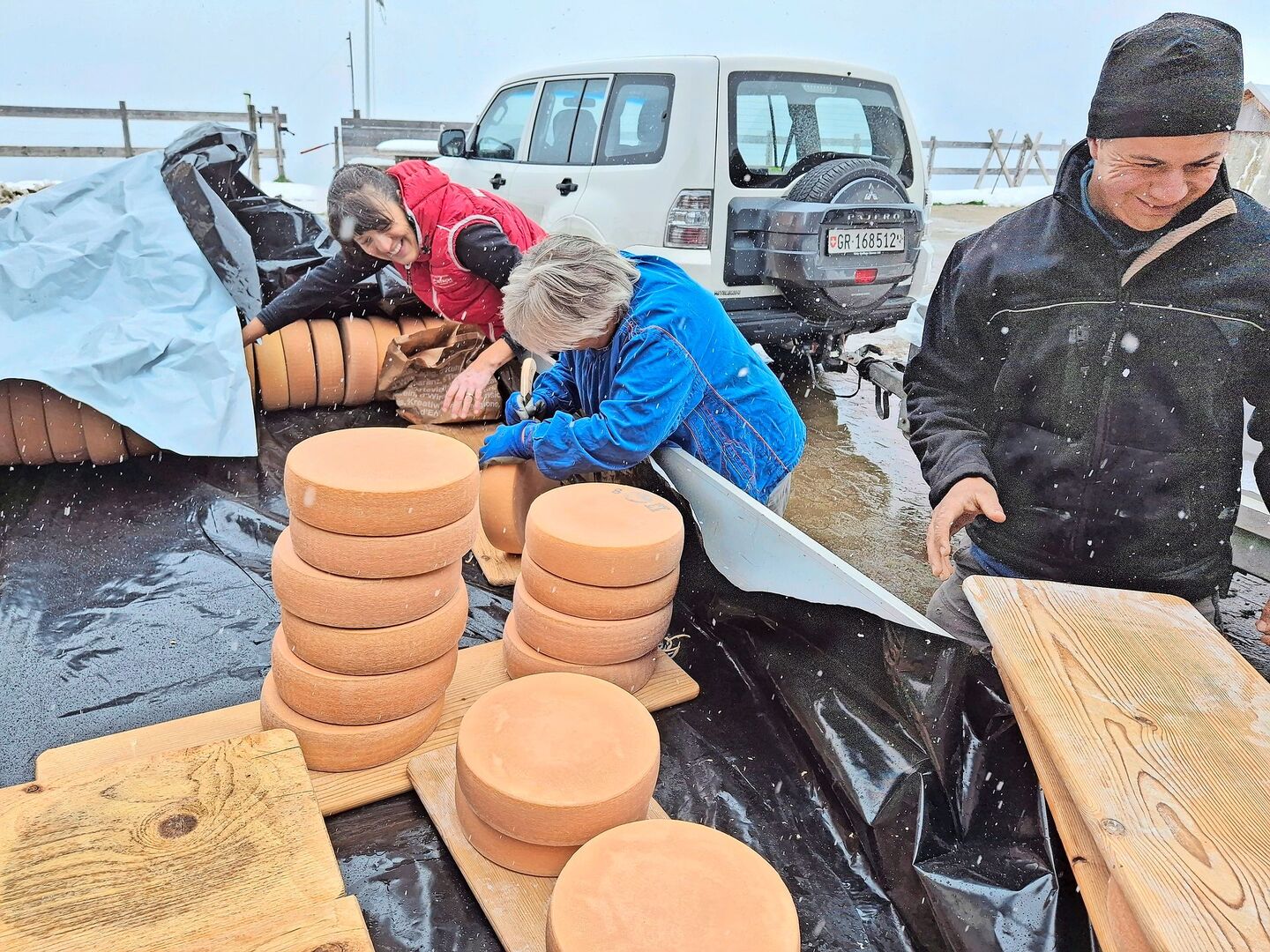 Eine Person nach der anderen kroch aus dem Bett und packte an, wo sie gebraucht wurde. Käserei putzen, Stall aufräumen, Kisten packen, es gab für alle genug zu tun. Da vor wenigen Tagen die Käseschmiermaschine den Geist aufgegeben hatte, fand ich Reto im Käsekeller mit der Bürste am Käseschmieren. Natürlich war auch Ronya bei ihm, ausgestattet mit Schürze und Bürste. Begeistert pflegte sie ihre Mutschli.