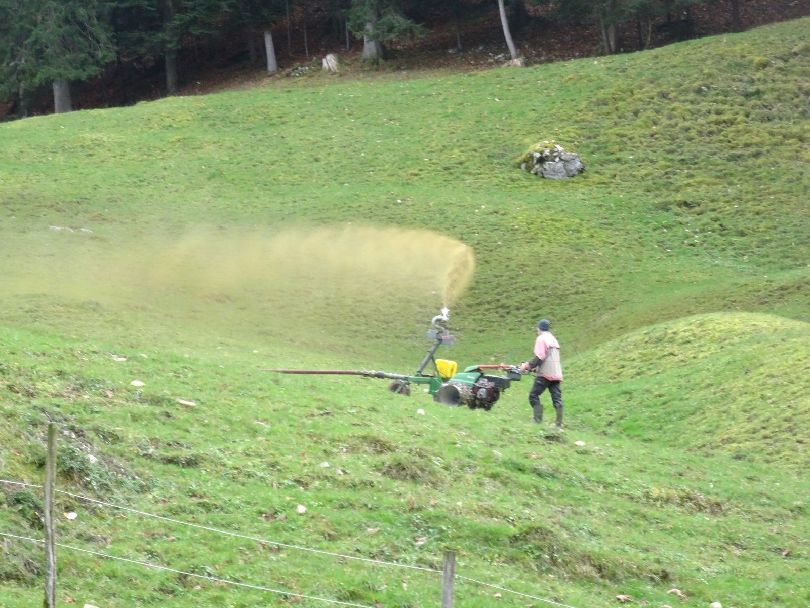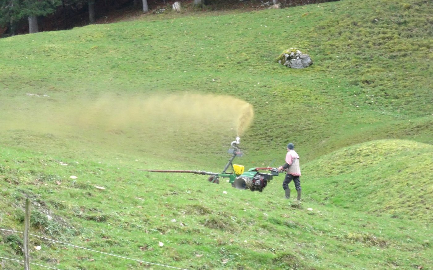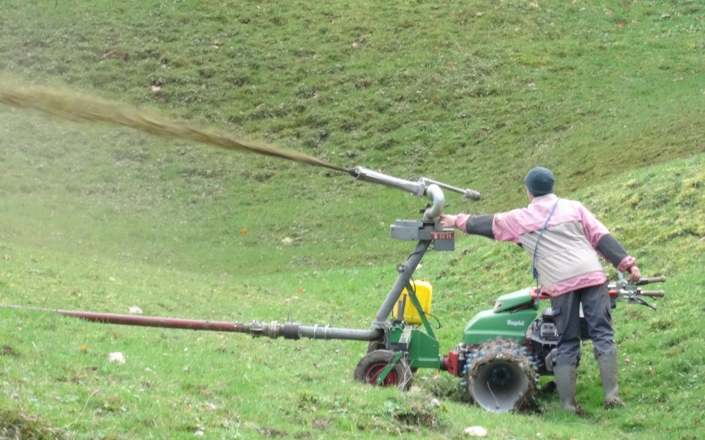 Doch nachdem die Familie auf ein Video aus Österreich gestossen ist, wird zum Verteilen der Gülle nur noch eine Person benötigt. «Wir haben einen Occasion-Gülleverteiler mit einem Rapid-Euro-4-Motormäher verbunden», so der Auszubildende. Dafür wurde ein Anhängebock mit Rädern in Grösse des Motormähers konstruiert. Der Motormäher bleibt entweder auf der Stelle stehen oder kann durch eine Person gesteuert werden.