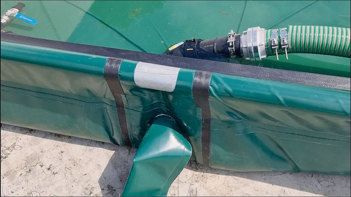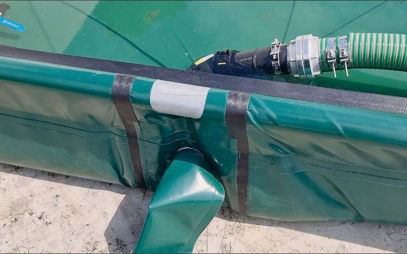 Wenn das Silo gedeckt ist, wird Wasser in die Schläuche gepumpt, um die Plane zu beschweren und den Futterhaufen abzudichten.