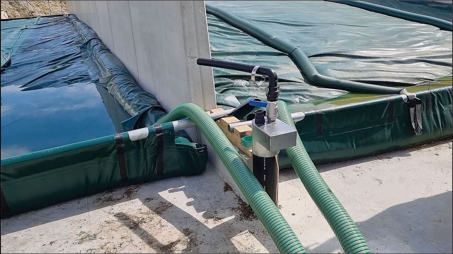 Um die Schläuche zu füllen, braucht es zehntausend Liter Wasser. Der unterirdische, 20 m³ grosse Tank muss nur einmal befüllt werden und speist sich danach selbst. Die Idee sei, dass durch den Druck des Wassers und der darunterliegenden Plane alle Seiten des Silos verschlossen würden, erklärt der Betriebsleiter.