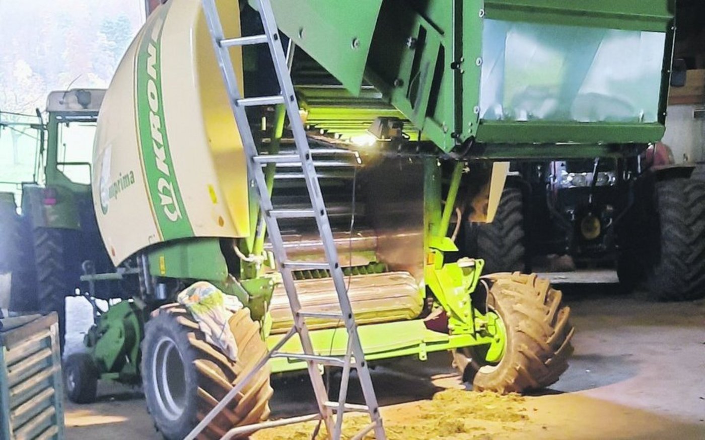 Am nächsten Tag nahm ich einen Kessel mit warmem Wasser und ein paar alte Tücher, die ich mir zuvor zurechtgeschnitten hatte, und holte eine Leiter: Die Aussenreinigung stand an. Ich ging mit dem nassen Tuch über die ganze Ballenpresse und wischte den Schmutz weg. Darauf folgend nahm ich ein trockenes Tuch und trocknete die Maschine ab.
