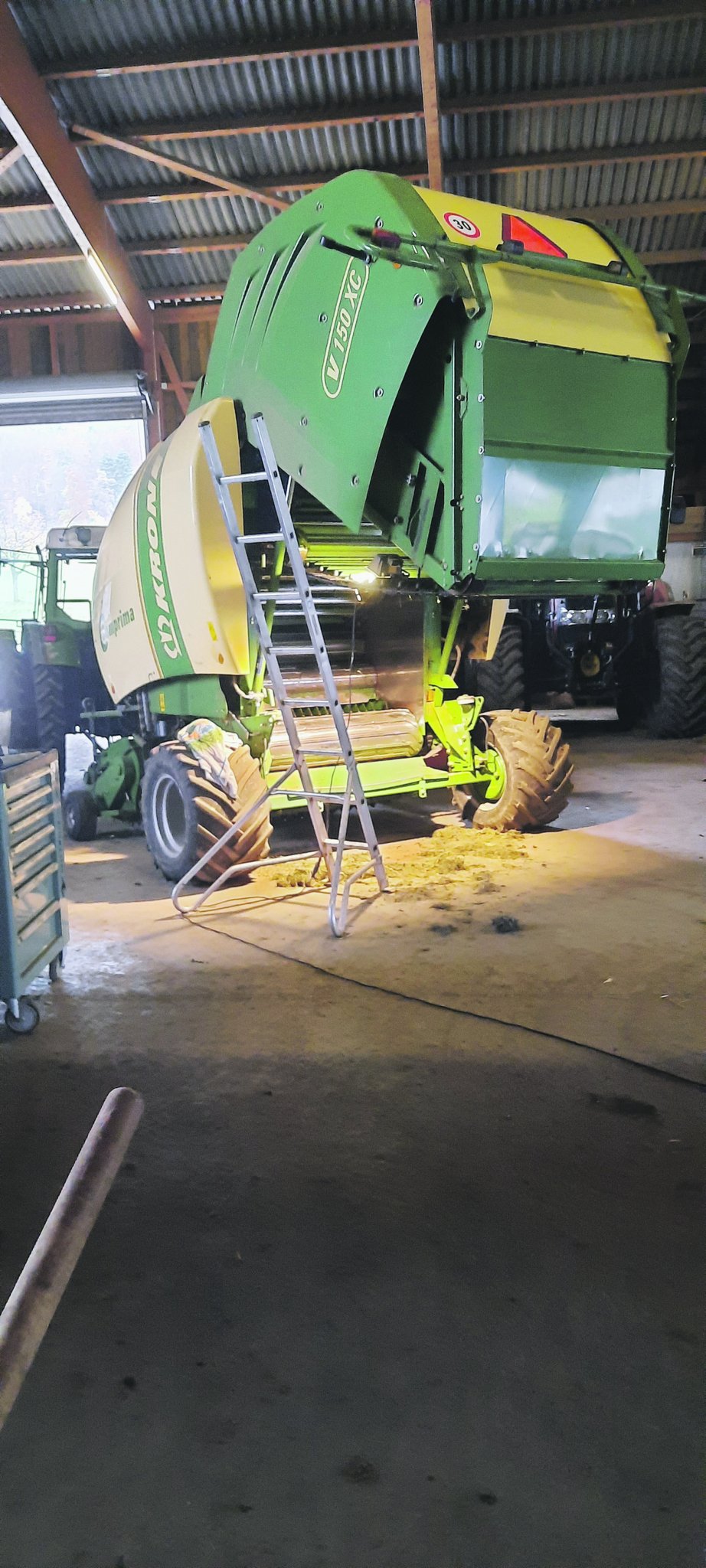 Jeden Winter werden unsere Maschinen, die über den Winter nicht in Gebrauch sind, eingewintert. Dieses Jahr übergab mir mein Chef die Aufgabe, die Ballenpresse zu reinigen. Das muss aber ohne Wasser geschehen, denn die Lager in der Ballenpresse sind sehr sensibel.
