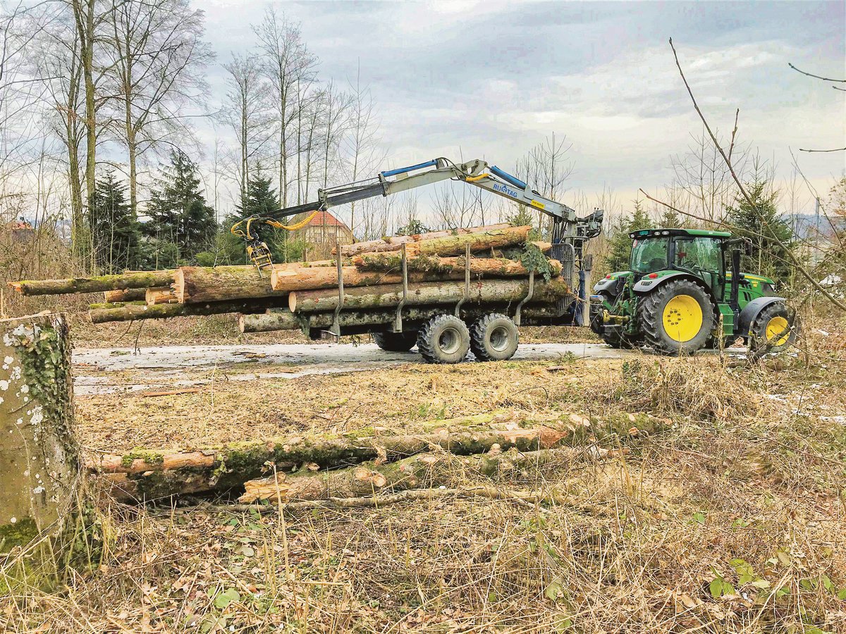 Zusammen haben wir die Bäume besichtigt und die Fällbereiche definiert. Meist kümmert sich mein Vater mit seiner Erfahrung um die Fällarbeiten, ich übernehme dann die Sicherungsaufgabe mit der Seilwinde oder helfe mit beim Entasten und Abtransportieren. Dieses Mal haben wir zum Fällen fast alle Bäume mit der Seilwinde gesichert und in Fallrichtung gezogen. Die Windverhältnisse sowie die teils stark angeschlagenen Bäume waren unberechenbar. Trotzdem konnten wir an einem Nachmittag acht Bäume sicher zu Boden bringen und diese für den Abtransport am Wegrand platzieren. Im Anschluss an die Fällarbeiten haben wir das Holz mit dem Rückewagen auf den Betrieb transportiert.