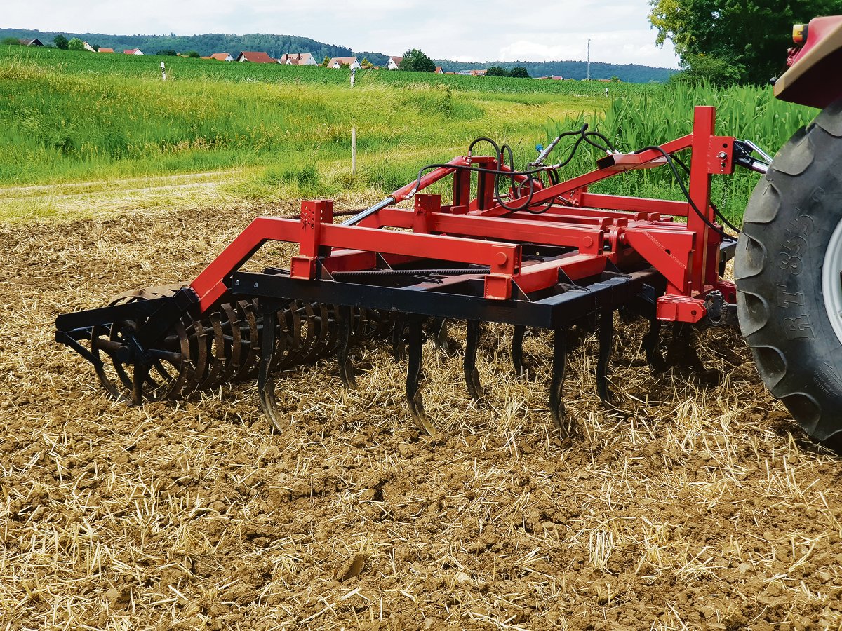Den Rahmen mit Dreipunktanhängung und Klappmechanismus hat der Max Bauer selbst konstruiert und gebaut. Die gekauften Scharen und Dachringwalzen wurden daran montiert. Mit dem Grubber ist eine Bodenbearbeitung von 5 bis 15 cm möglich. Die Tiefe wird über Steckbolzen eingestellt. Wie bei einem herkömmlichen Grubber wird die Mechanik über die Hydraulik bewegt und über einen Sperrblock gehalten.