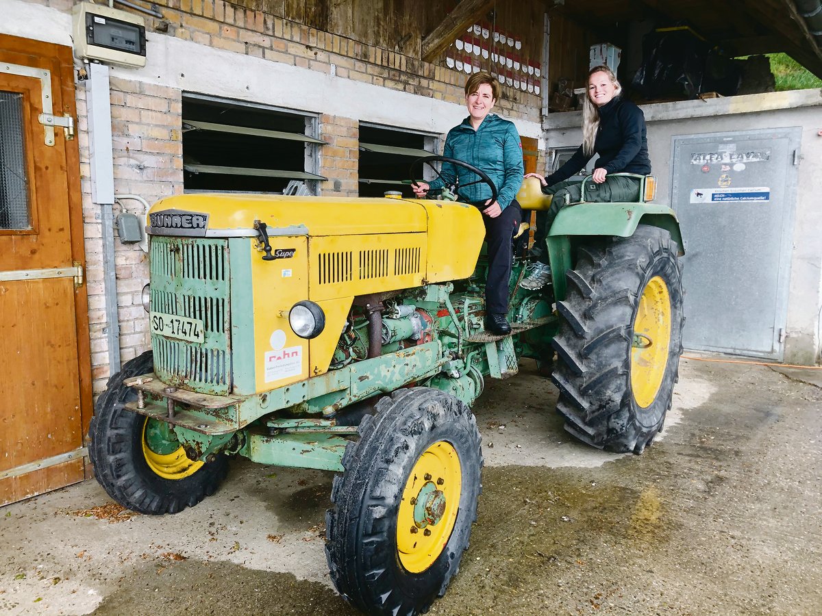Der Oldtimer gehört Kathrin Niemetz’ Bruder Christian Frey. Dieser überholt und restauriert ihn zurzeit komplett. Fahren darf den Traktor nur die Chefin. Ihre Lernende, Martina Ackermann, muss aus versicherungstechnischen Gründen auf dem Kinder-sitzli Platz nehmen, da der Sturzbügel fehlt.