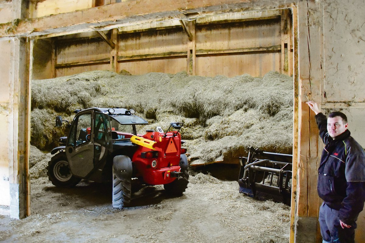 Zur Verstärkung wurden zwei kleinere herausnehmbare Balken eingepasst. So können wir jetzt mit dem Teleskoplader und der Krokozange das Heu entnehmen, wodurch wir eine Menge Zeit einsparen können.