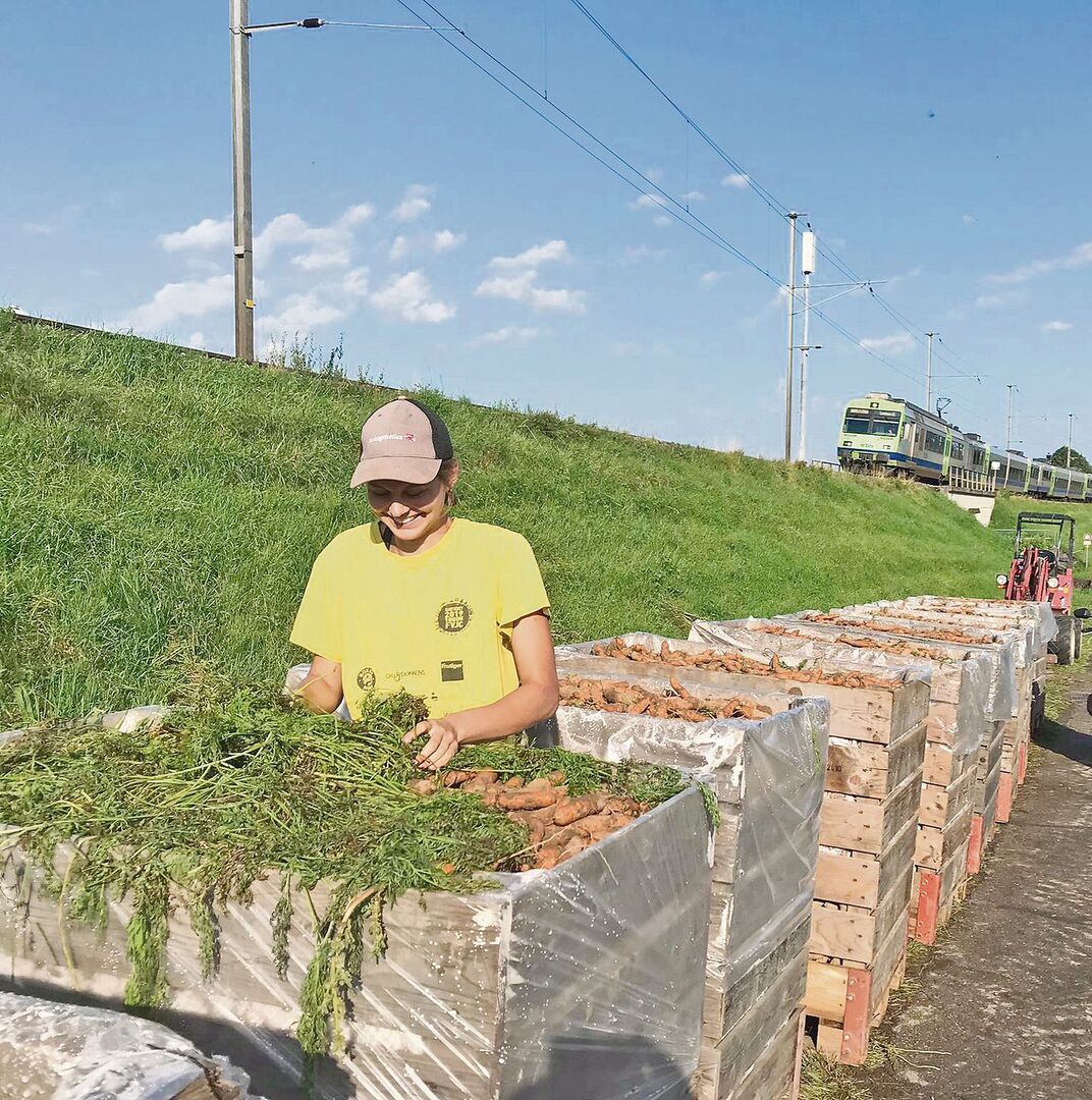 Ich bin zwar noch nicht lange in Vielbringen, aber es gab schon einige Highlights: Am 10. August haben wir die Karotten geerntet. Ein anderer Bauer ist mit seiner Maschine gekommen und wir haben 57 Paloxen gegraben. Wir ernteten 24 Linien à je fast 200 Meter. Ich bin auf der Maschine gestanden, um die Rüebli zu sortieren. Meine Aufgabe war es, die schlechten und die zu grossen Rüebli für die Kühe wegzunehmen. Sie hatten eine grosse Freude, diese zu fressen!