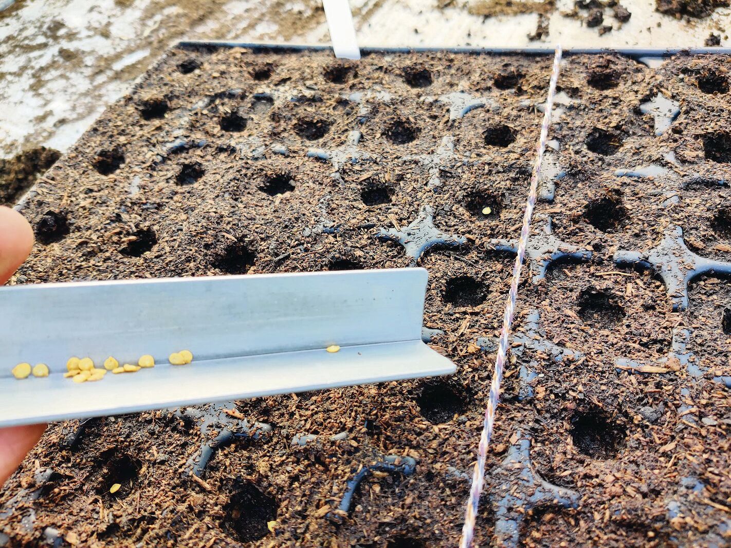 Dazu werden in einem ersten Schritt die Anzuchtschalen mit Erde befüllt. Die Erde muss so dicht in die 77 einzelnen Parzellen eingepresst werden, bis die Finger (jedenfalls meine) schmerzen. Anschliessend wird das Ganze gut bewässert. Nun gilt es, mit einer Schablone in jedes Abteil mittig ein Loch zu drücken. In jede Vertiefung wird jetzt genau ein Samen gelegt.