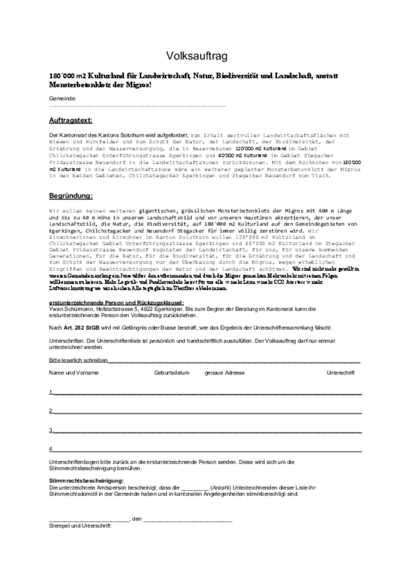 Die Einwohnerinnen und Einwohner im Kanton Solothurn wollen dieses Kulturland zugunsten der Landwirtschaft, für sich selbst, ihre kommenden Generationen, für die Natur, für die Biodiversität, für die Ernährung und der Landschaft und zum Schutz der Wasserversorgung vor der Überbauung durch die Migros, wegen erheblichen Eingriffen und Beeinträchtigungen der Natur und der Landschaft schützen. Zudem sind die Betroffenen nicht weiter gewillt, in ihren Gemeinden entlang am Jurasüdfuss den aufkommenden und durch die Migros gemachten Mehrverkehr mit seinen Folgen willkommen zu heissen. «Mehr Logistik- und Pendlerverkehr heisst für uns alle mehr Lärm, mehr Co2-Ausstoss und mehr Luftverschmutzung, was wir eh schon alle tagtäglich im Überfluss abbekommen», heisst es im Volksauftrag weiter. Der Landwirtschaftliche Bezirksverein Gäu wie auch der Solothurner Bauernverband stützt das Hauptziel des Volksauftrags, die Schonung der wertvollen Agrarfläche im Gäu.