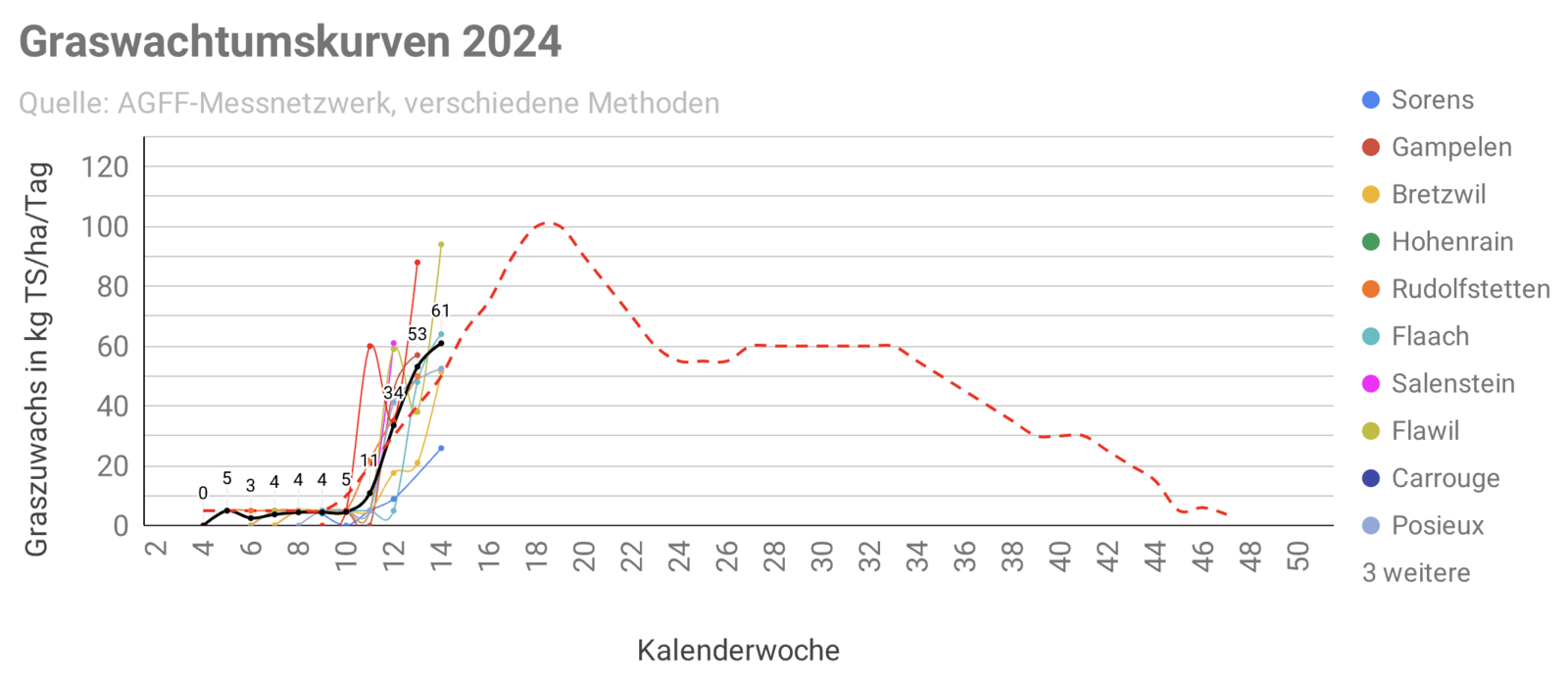 Das Graswachstum ist durch die höheren Temperaturen vereinzelt auf bis zu 60 kg TS/ha Tag gestiegen, wird jedoch aufgrund der kühleren Nächte noch zurückgehalten. Ist das Wachstum nicht zufriedenstellend oder treten gar Mangelsymptome auf, lohnt es sich, das Düngemanagement genauer zu analysieren, um das starke Frühjahreswachstum zu nutzen. Auch der Schwefel (S) sollte dabei berücksichtigt werden.