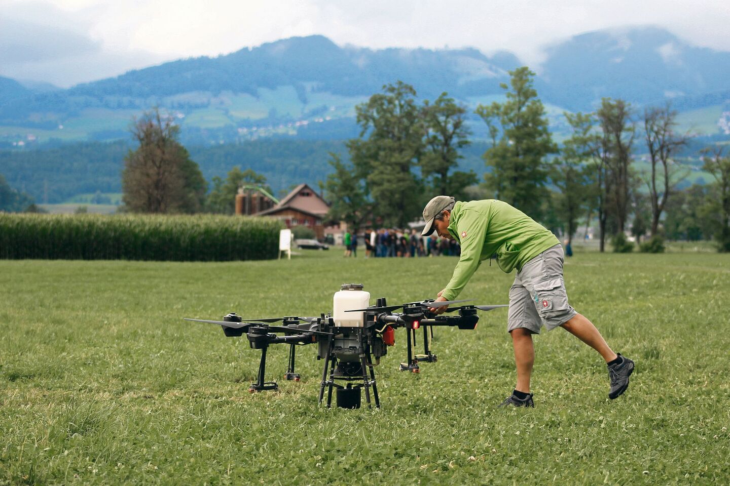 Hauptsächlich werde sie jedoch zur Ausbringung von Pflanzenschutzmitteln in Steillagen genützt, erklärte Wiesli: «Wir sind oft im Rebbau unterwegs oder auf steilen Weiden, um Farn oder Disteln zu spritzen.» Der fliegende Helfer eignet sich auch zur Unter- oder Übersaat oder für den Nützlingsabwurf von Trichogramma-Schlupfwespen.